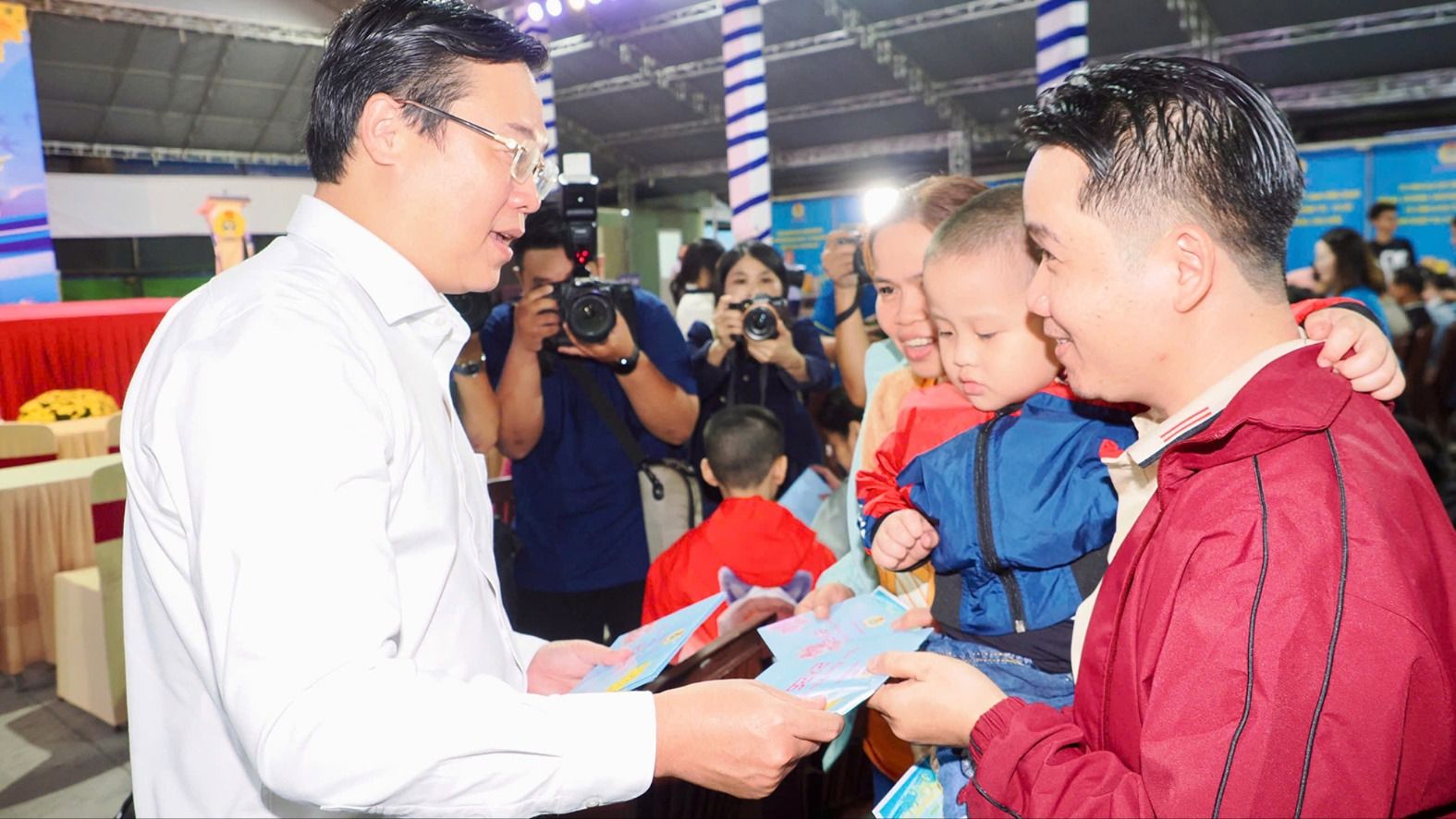 Phó Bí thư Thường trực Thành ủy TPHCM Lê Quốc Phong trao quà tiễn công nhân về quê trên chuyến xe công đoàn. Ảnh: HOÀNG HÙNG