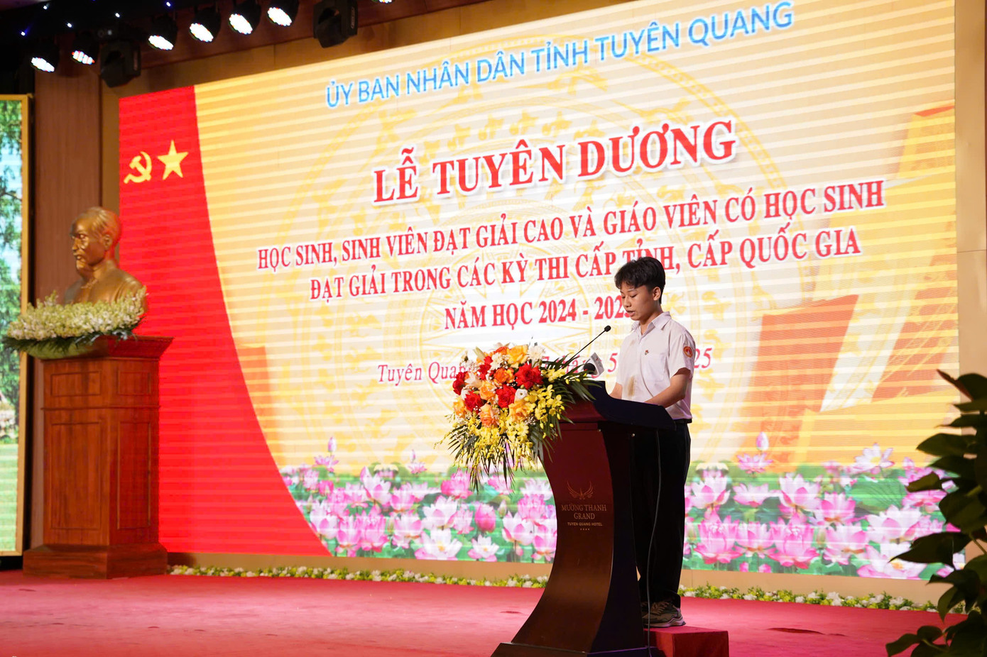 Trần Đoàn Việt đại diện học sinh phát biểu tại lễ tuyên dương của Tỉnh Tuyên Quang.