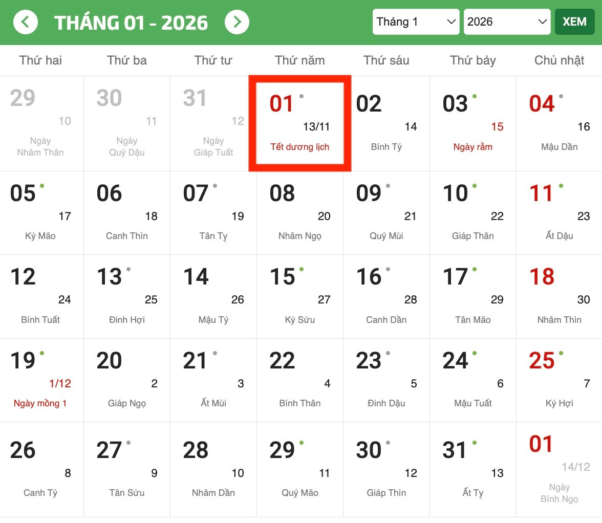 Đối chiếu với lịch năm 2026, ngày 1/1/2026 rơi vào thứ Năm. Như vậy, Lịch nghỉ Tết Dương lịch 2026 của người lao động là 1 ngày, đúng theo quy định của pháp luật. Do ngày nghỉ nằm giữa tuần nên không phát sinh ngày nghỉ bù.