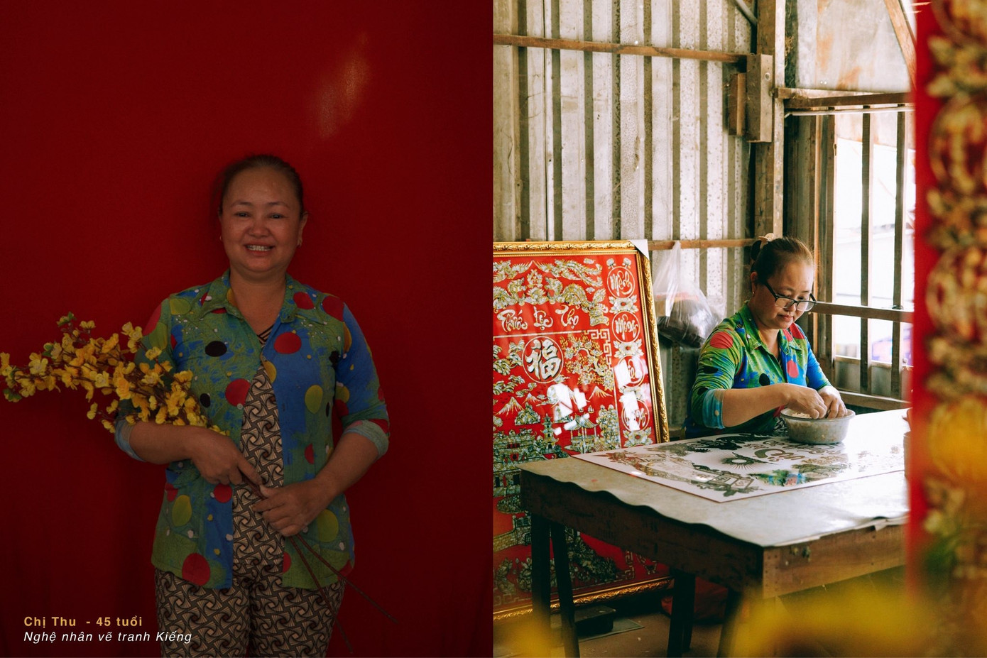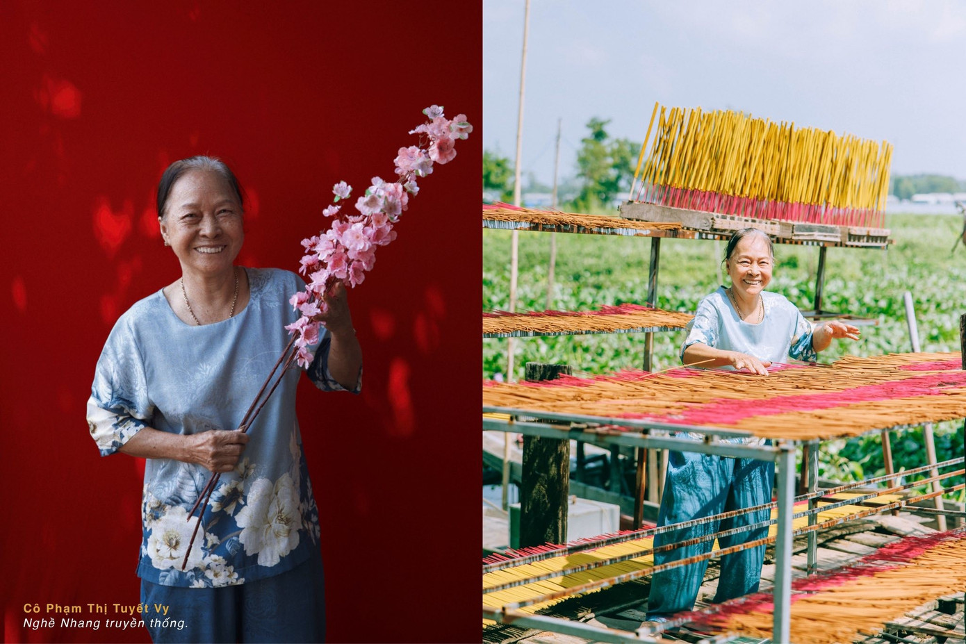 Điểm mới của bộ ảnh năm 2026 là Sơn Đoàn và nhóm chụp ảnh các cô chú ở những làng nghề truyền thống tại An Giang. Điều đó làm cho bộ ảnh có chiều sâu hơn và kể được câu chuyện rõ ràng hơn về văn hóa, nghề truyền thống và cả về con người. “Đó là bà Hai hơn 60 năm làm nghề nón lá truyền thống. Bà Tạng gắn bó với nghề từ bé đến nay đã 79 năm. Anh Nghĩa vẫn ngày ngày miệt mài làm nên những chiếc gáo dừa thật đẹp. Cô Vy vẫn cặm cụi làm góp nên những bó nhang Giao thừa… Tụi mình nhìn những nụ cười, những lần đầu được chụp ảnh, những cái bắt tay, cái cảm ơn mà thấy lòng ấm áp đến lạ. Khi đi và chụp ảnh, mình mới biết quê hương vẫn còn nhiều làng nghề truyền thống đến như vậy”, Sơn Đoàn viết dòng suy nghĩ trên mạng xã hội.