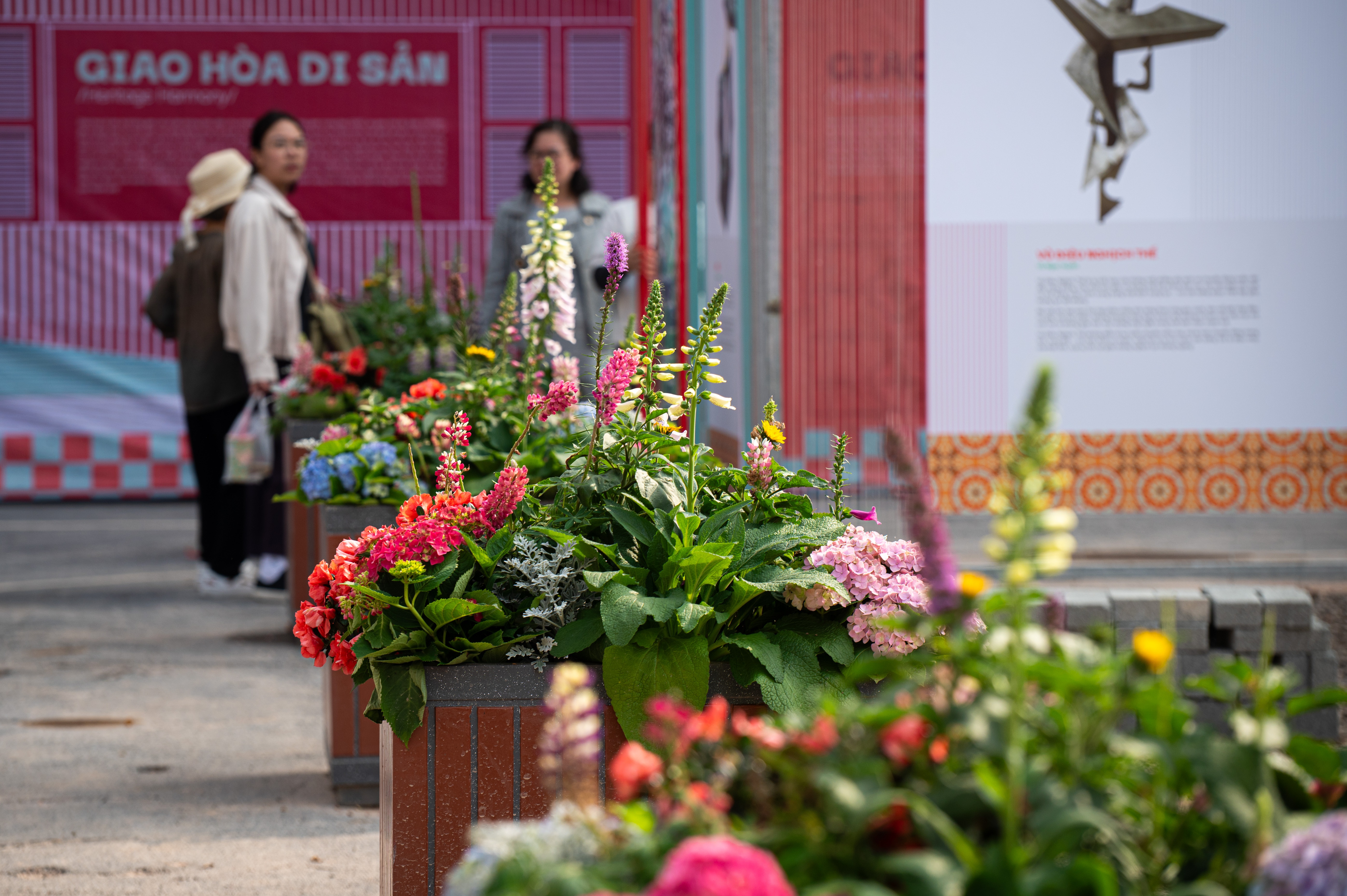 Nhiều chậu hoa tươi được bố trí xung quanh không gian hoàn trả tạm phía Đông hồ Hoàn Kiếm.