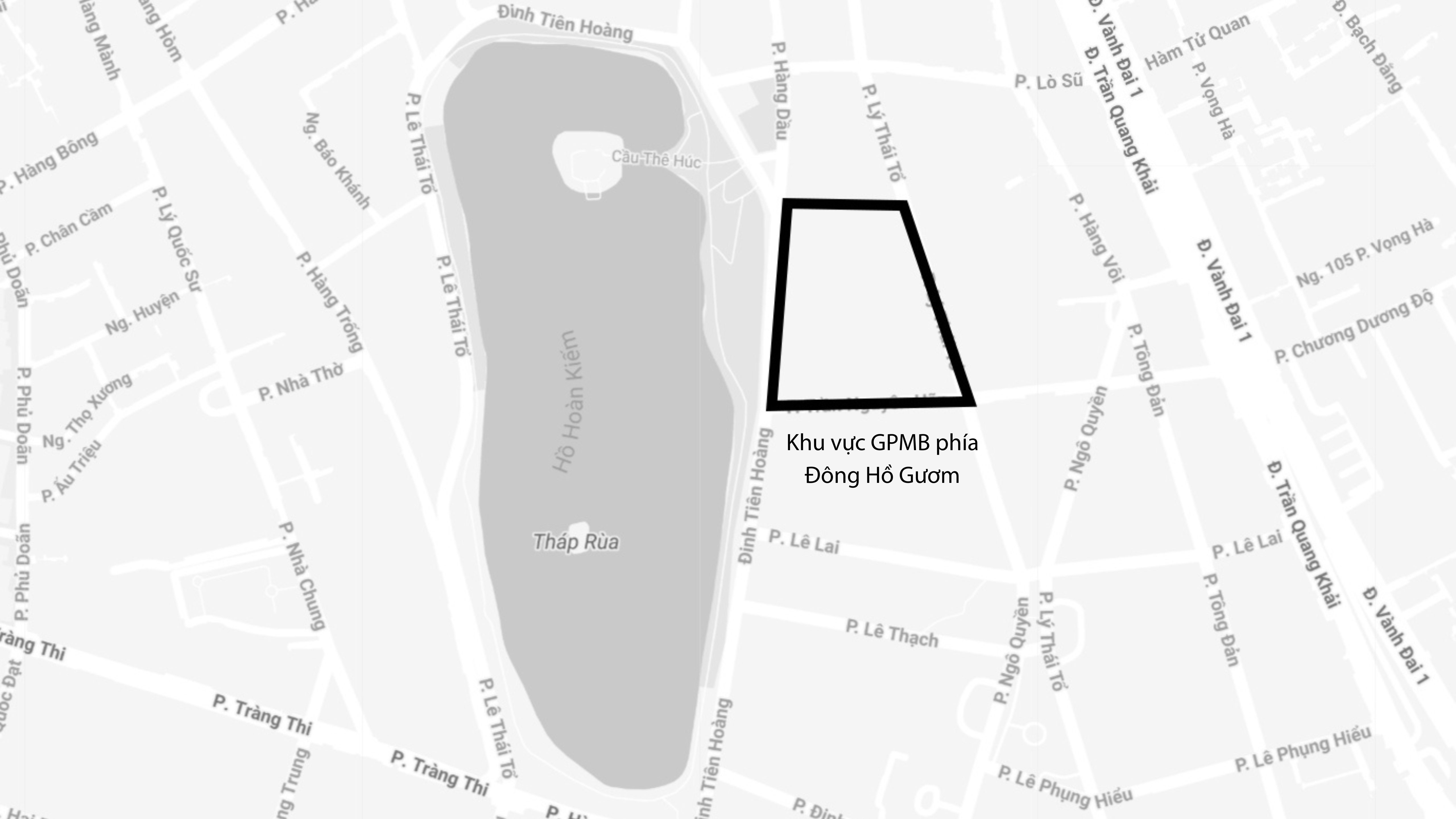 Dự án quảng trường, công viên phía Đông hồ Hoàn Kiếm (Hà Nội) có tổng diện tích khoảng 2,14 ha. Khu đất có ranh giới phía tây giáp hồ Hoàn Kiếm và đường Đinh Tiên Hoàng, phía Bắc giáp khu dân cư hiện có, phía Đông giáp phố Lý Thái Tổ; phía Nam giáp phố Trần Nguyên Hãn. Trong khu vực quy hoạch của dự án, có 59 chủ sử dụng nhà đất, bao gồm 17 tổ chức và 42 hộ dân. Ảnh: Google Maps.
