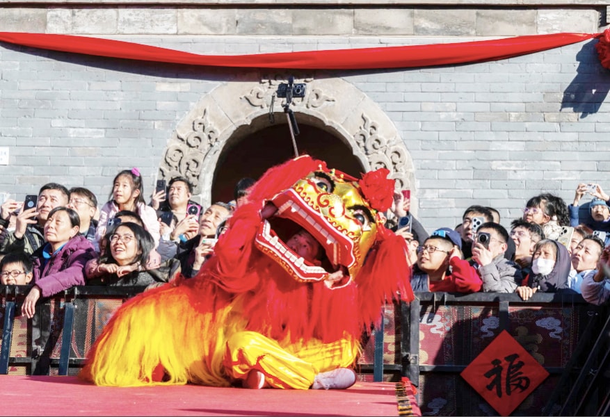 Người dân xem các nghệ sĩ múa lân biểu diễn tại chùa Đông Nguyệt, Bắc Kinh (Trung Quốc). Ảnh: Getty