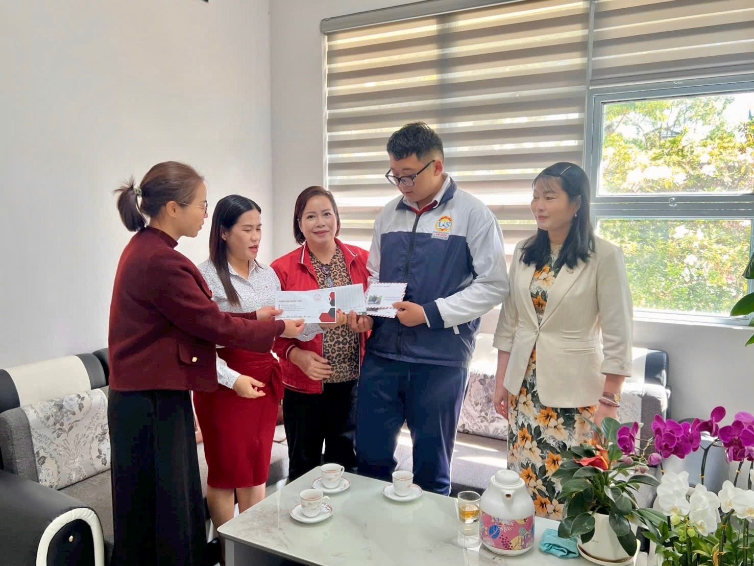 Bà Nguyễn Thị Ngọc (thứ 3 từ trái sang) cùng nhóm thiện nguyện trao quà tết cho em Huy Hoàng - học sinh lớp 9A9, Trường THCS Lam Sơn, phường Cam Ly - Đà Lạt
