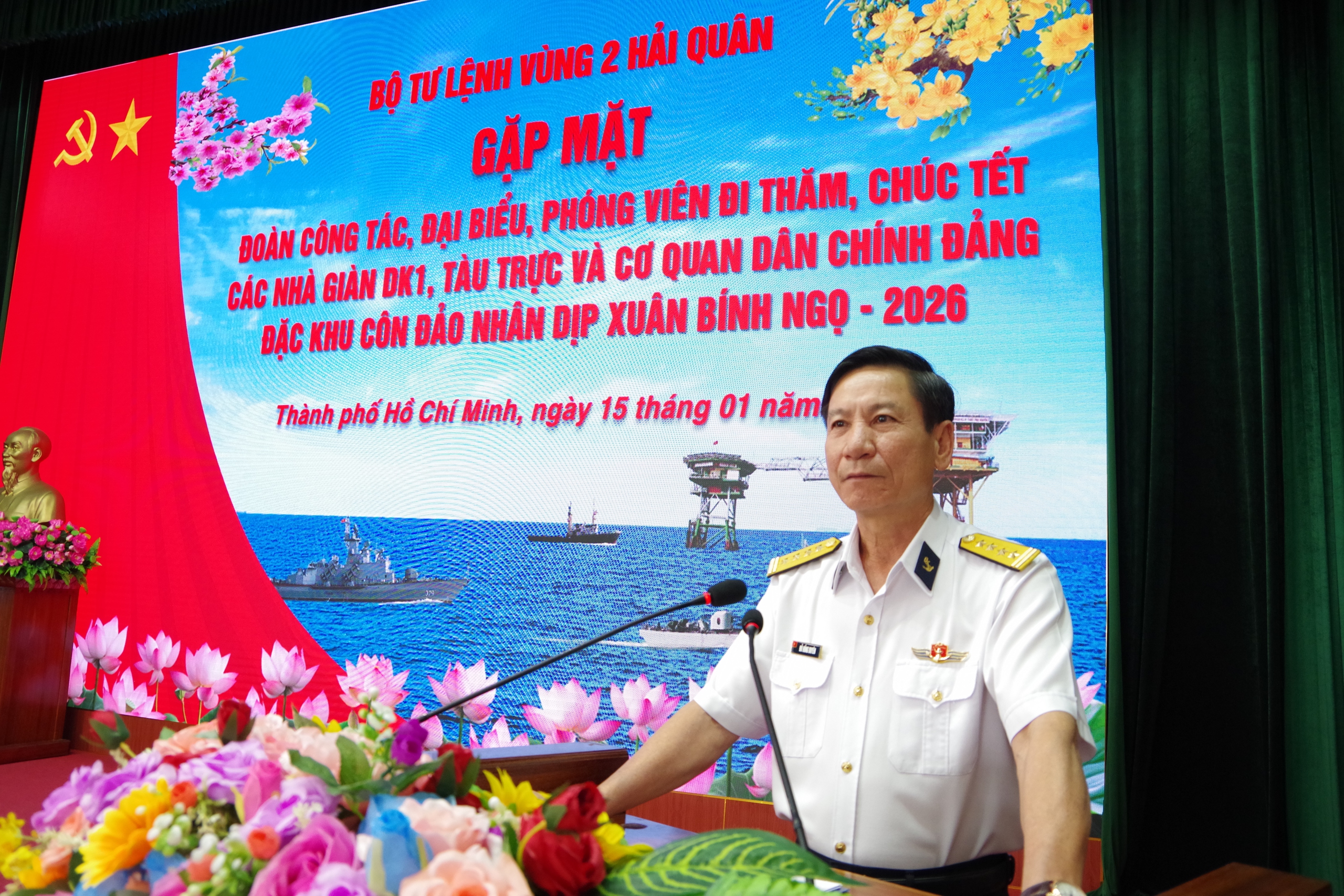 Phát biểu tại lễ tiễn đoàn, Đại tá Đỗ Hồng Duyên - Phó Chính ủy Hải quân Vùng 2 nhấn mạnh: đây là chuyến công tác đặc biệt, thăm hỏi, chúc Tết các nhà giàn DK1, tàu trực và cơ quan dân, chính, đảng Đặc khu Côn Đảo đang làm nhiệm vụ nơi đầu sóng ngọn gió.