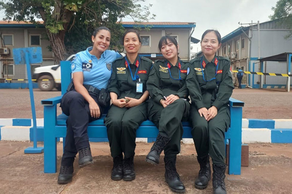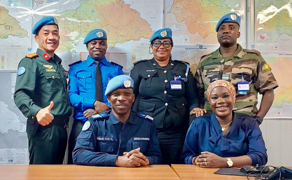 3 nữ sĩ quan Tổ công tác gìn giữ hòa bình số 6 của Bộ Công an tại Phái bộ MINUSCA, Cộng hòa Trung Phi và đồng nghiệp quốc tế.
