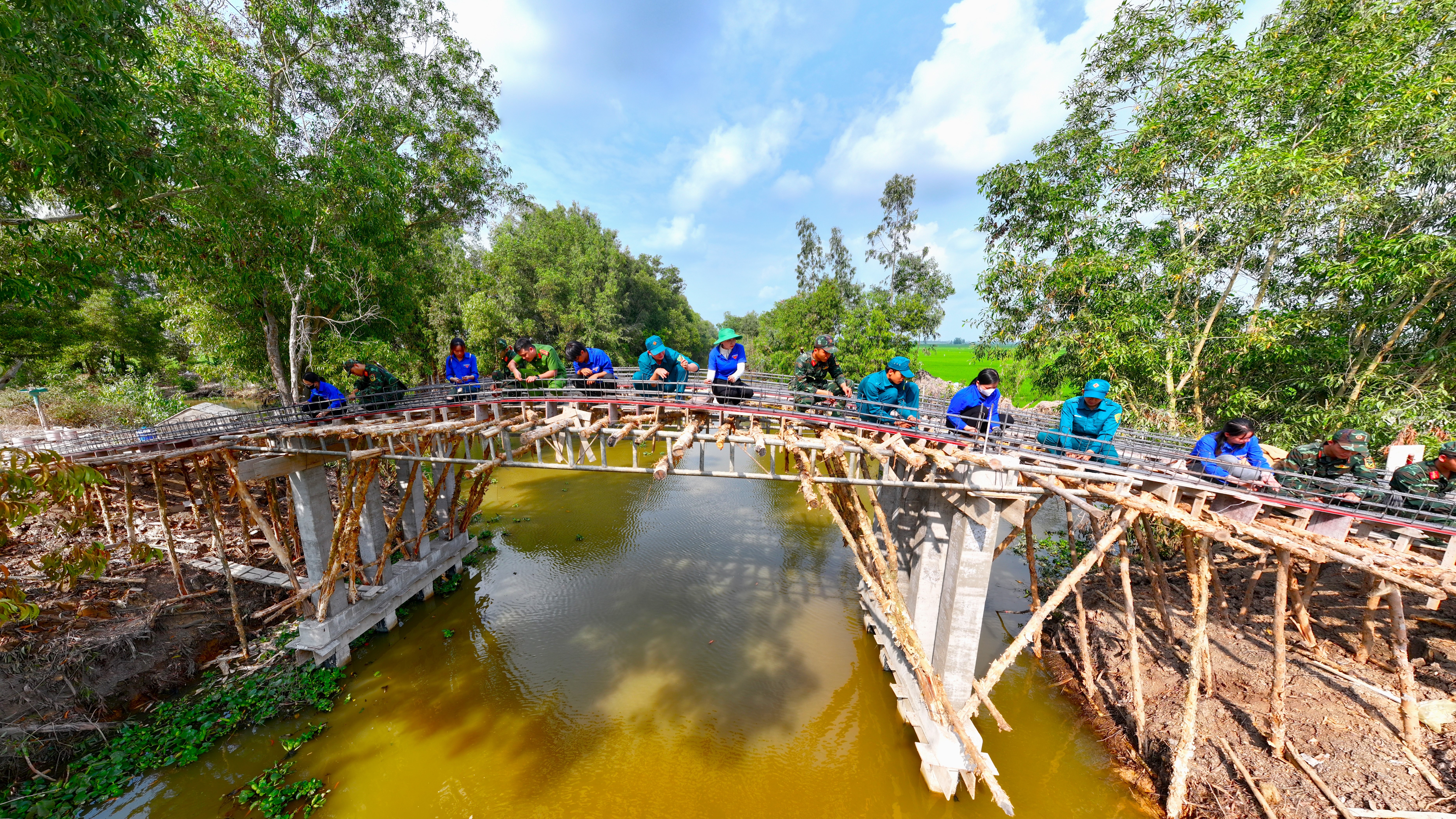 Cán bộ, chiến sĩ Tiểu đoàn 207 phối hợp cùng đoàn viên thanh niên và bà con nhân dân địa phương xây dựng cầu Kênh 9, ấp Tân Điền, xã Hòa Điền. (Ảnh: Phương Vũ)