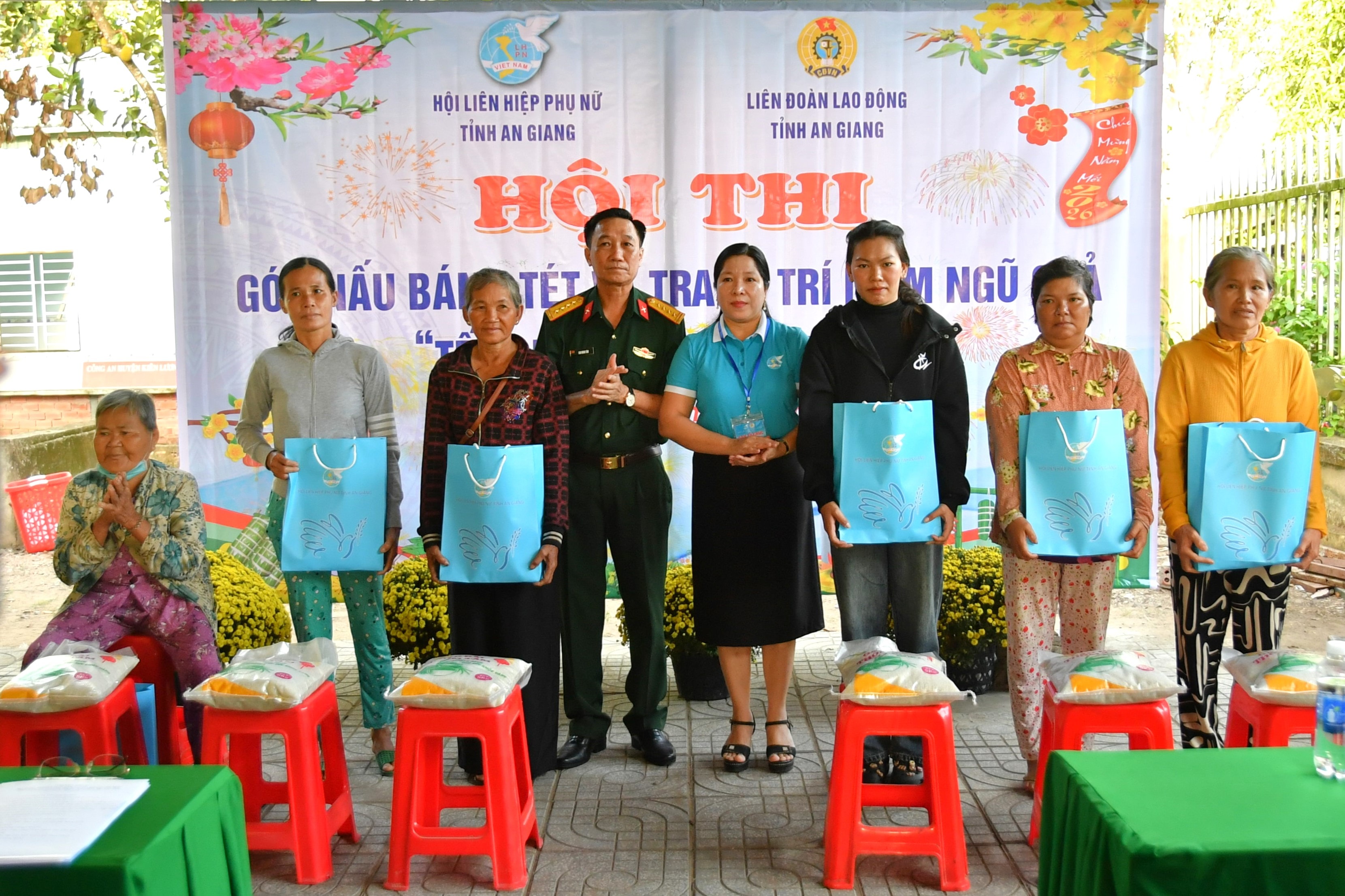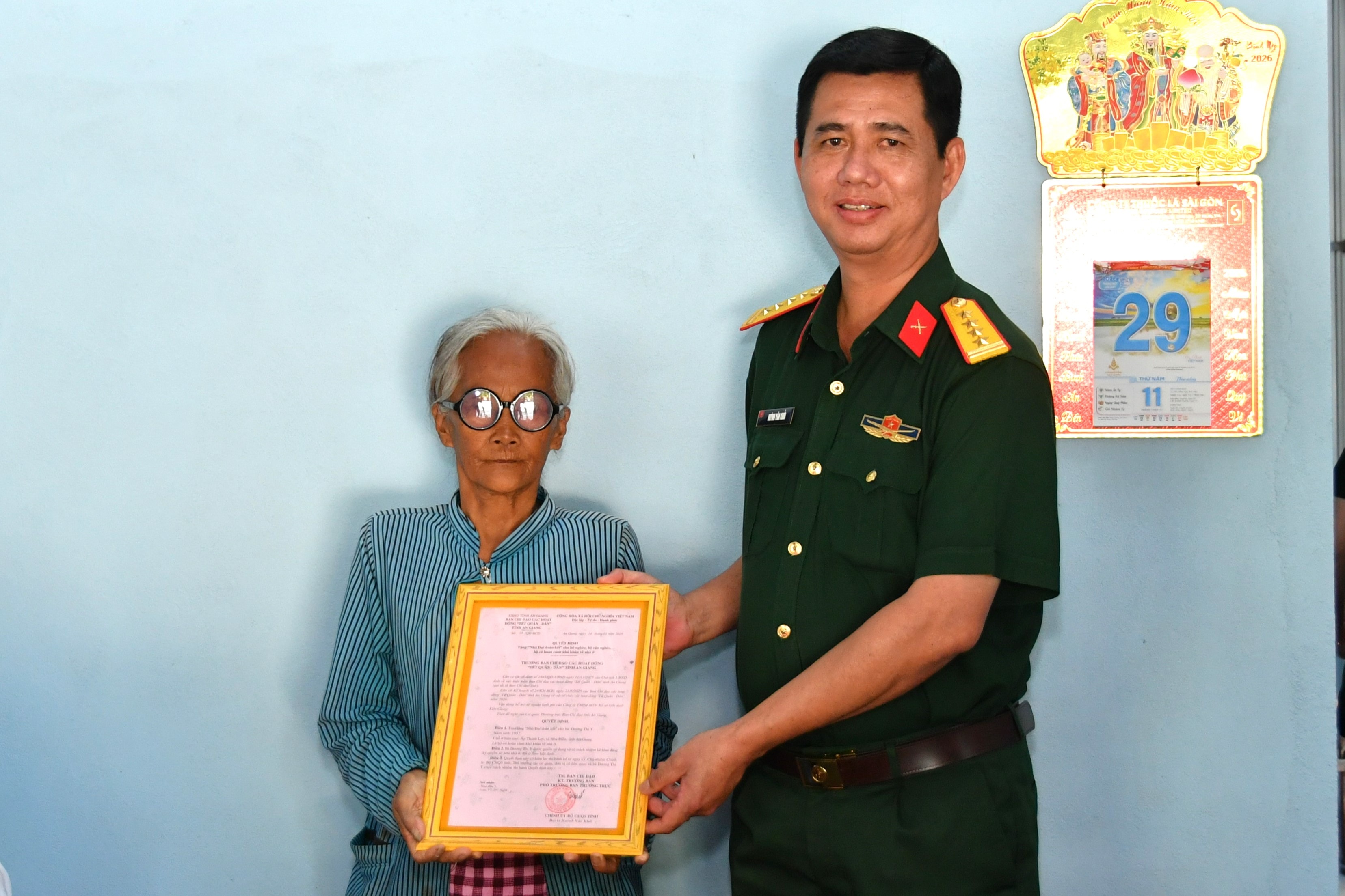 Đại tá Cao Minh Tâm, Phó Chính ủy Bộ CHQS tỉnh và bà lê Thị Ngọc Dung, Phó Chủ tịch Hội Liên hiệp Phụ nữ tỉnh An Giang trao quà cho người dân khó khăn dịp tết quân dân 2026. (Ảnh: Phương Vũ)