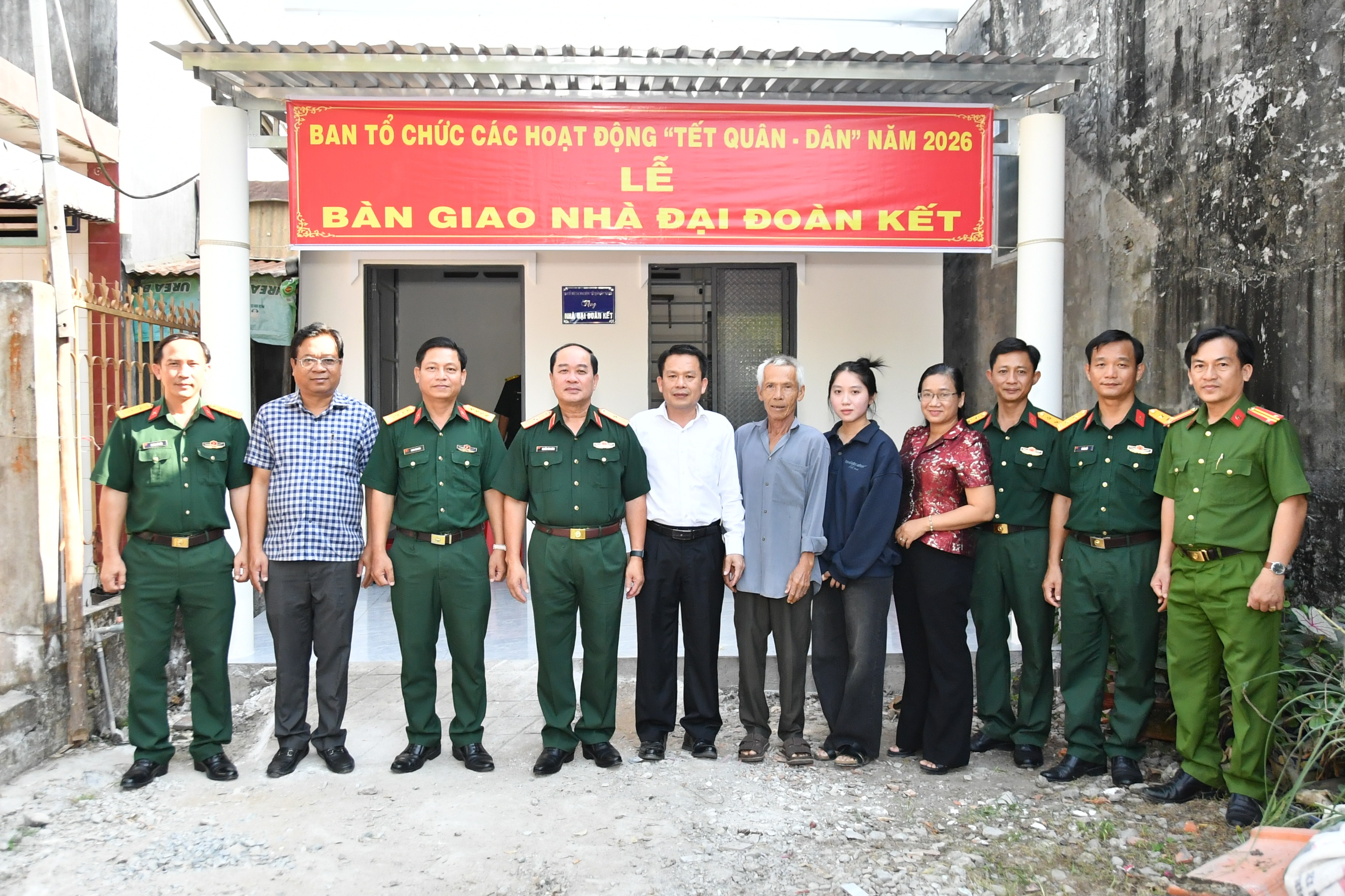 Ban Chỉ đạo các hoạt động Tết Quân Dân năm 2026 bàn giao nhà đại đoàn kết cho gia đình ông Võ Văn Thảnh, ngụ ấp Hòa Giang, xã Hòa Điền. (Ảnh: Phương Vũ)