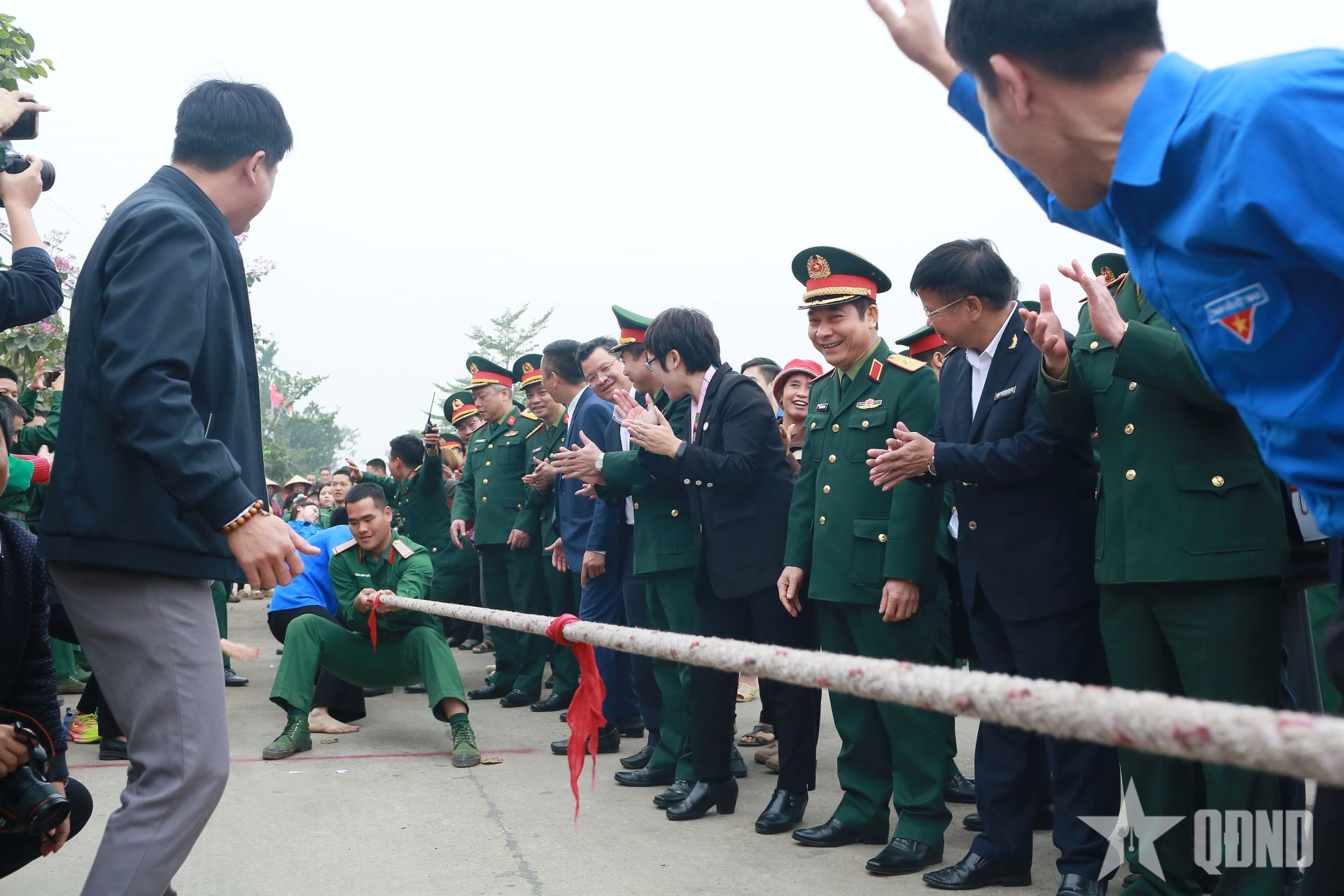 Cán bộ, chiến sĩ tham gia trò chơi kéo co với người dân địa phương.