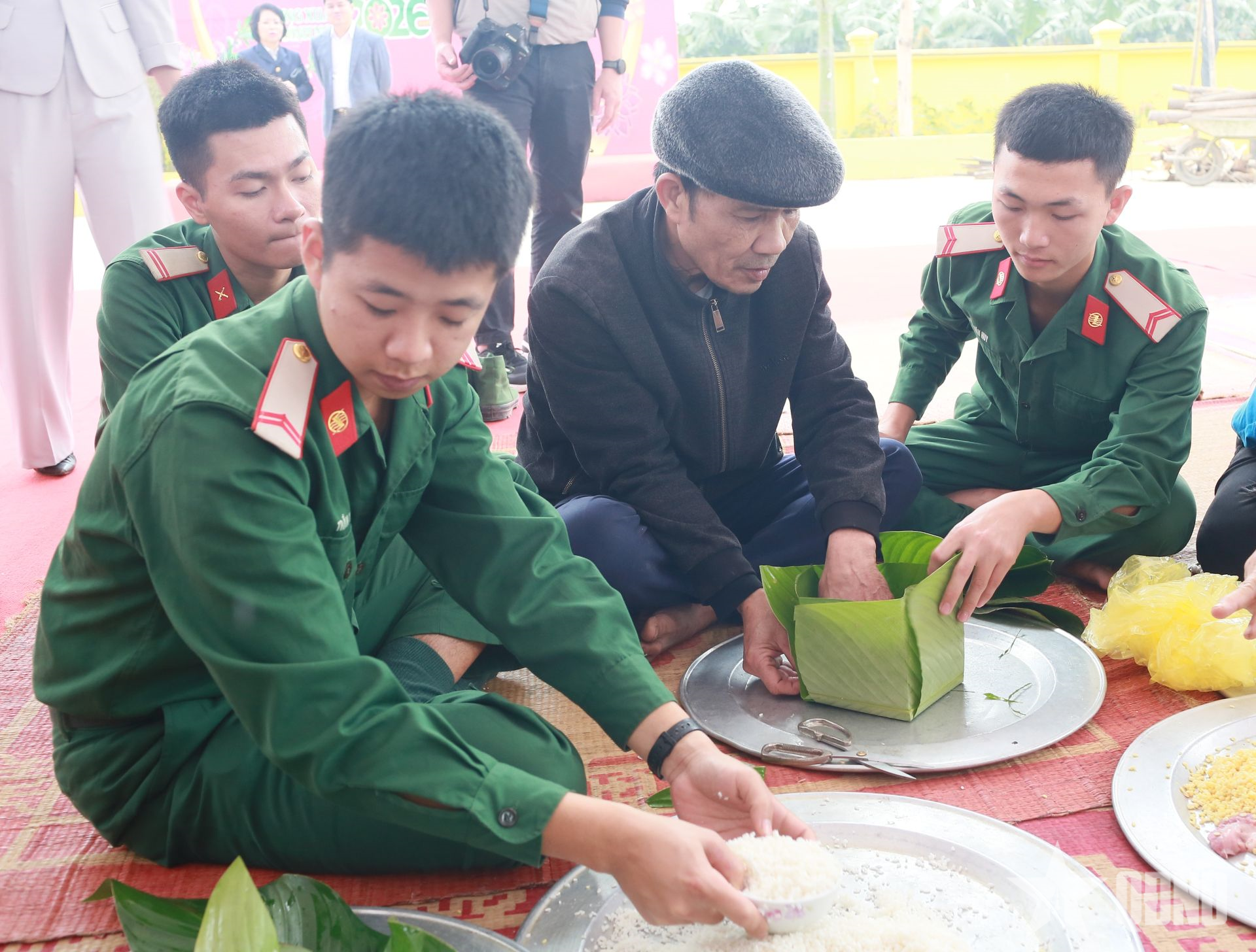 Các chiến sĩ trẻ học cách gói bánh chưng truyền thống.