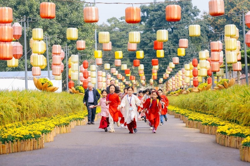 Các em nhỏ vui đùa tại đường hoa ở Hoàng thành Thăng Long
