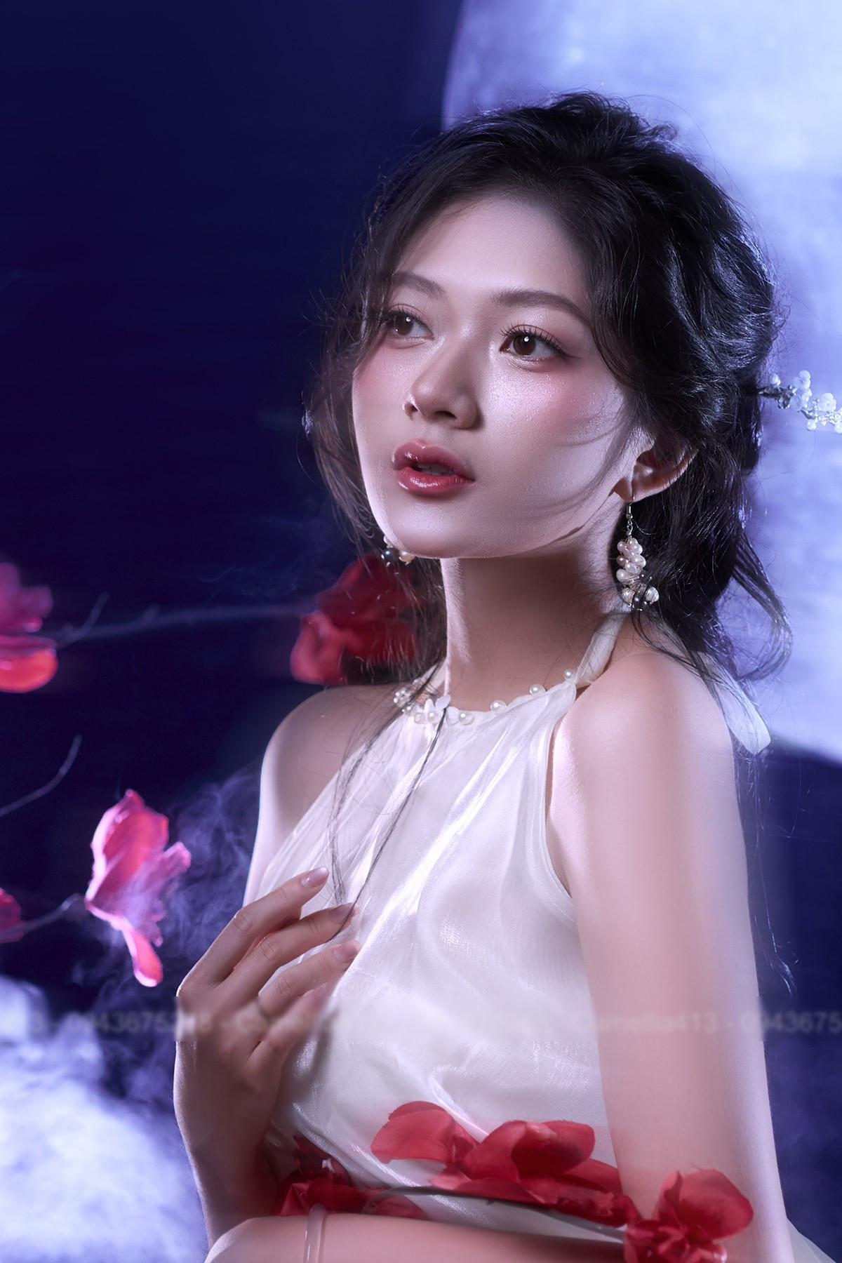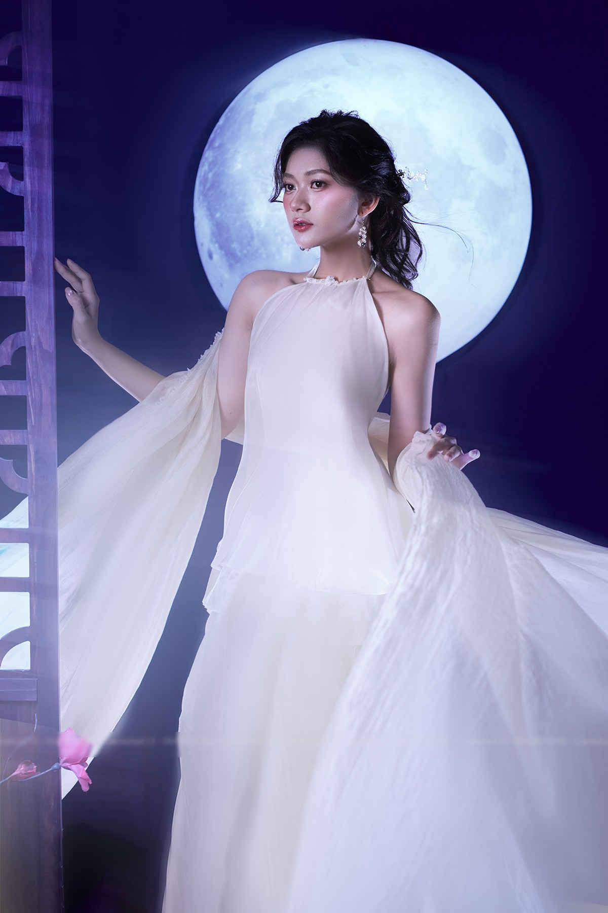 Hình ảnh chị Hằng Nga và vầng trăng tròn không chỉ là những biểu tượng quen thuộc của Tết Trung thu, mà còn tượng trưng cho sự viên mãn, sum vầy và vẻ đẹp truyền thống. Kim Ngân đã khéo léo lồng ghép những yếu tố này vào bộ ảnh, tạo nên một không gian vừa cổ điển, vừa hiện đại, thơ mộng, mang đậm dấu ấn cá nhân.