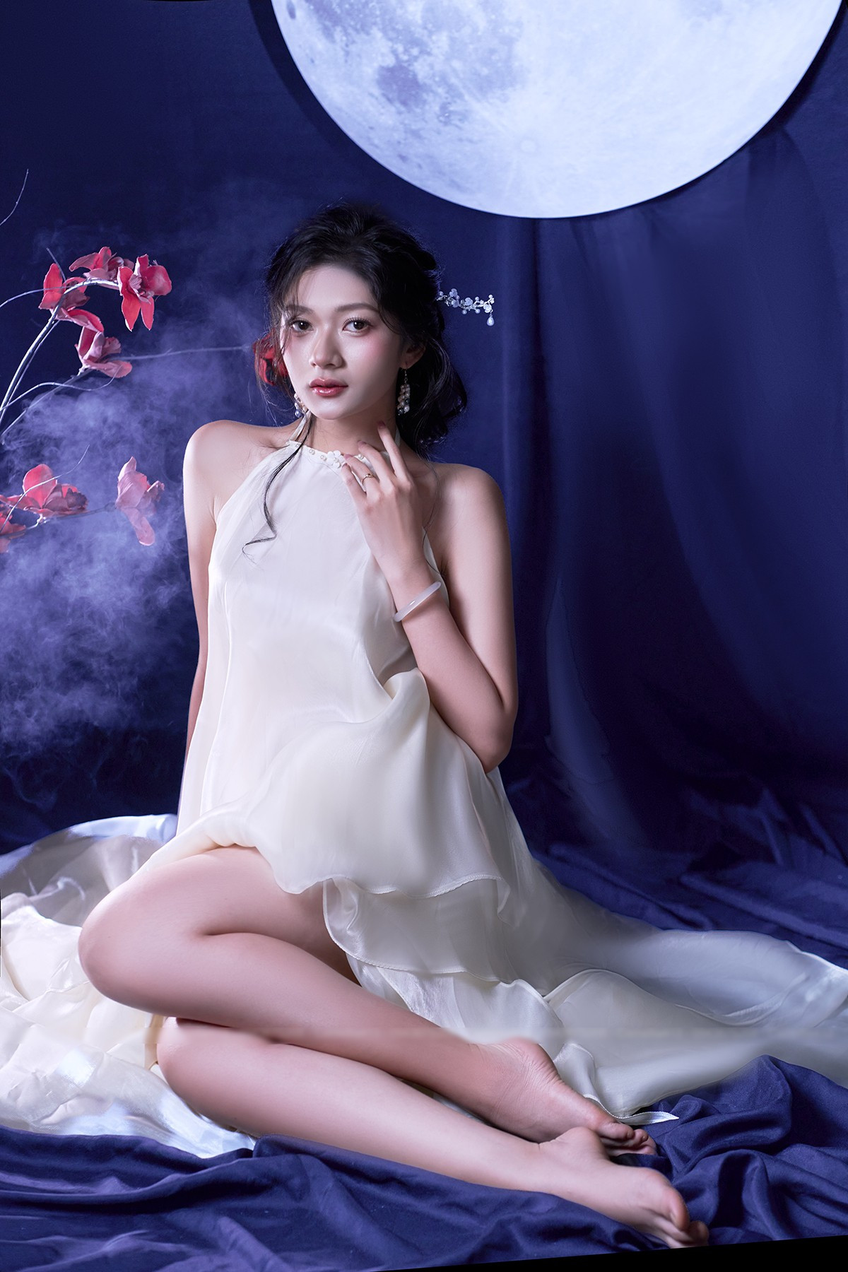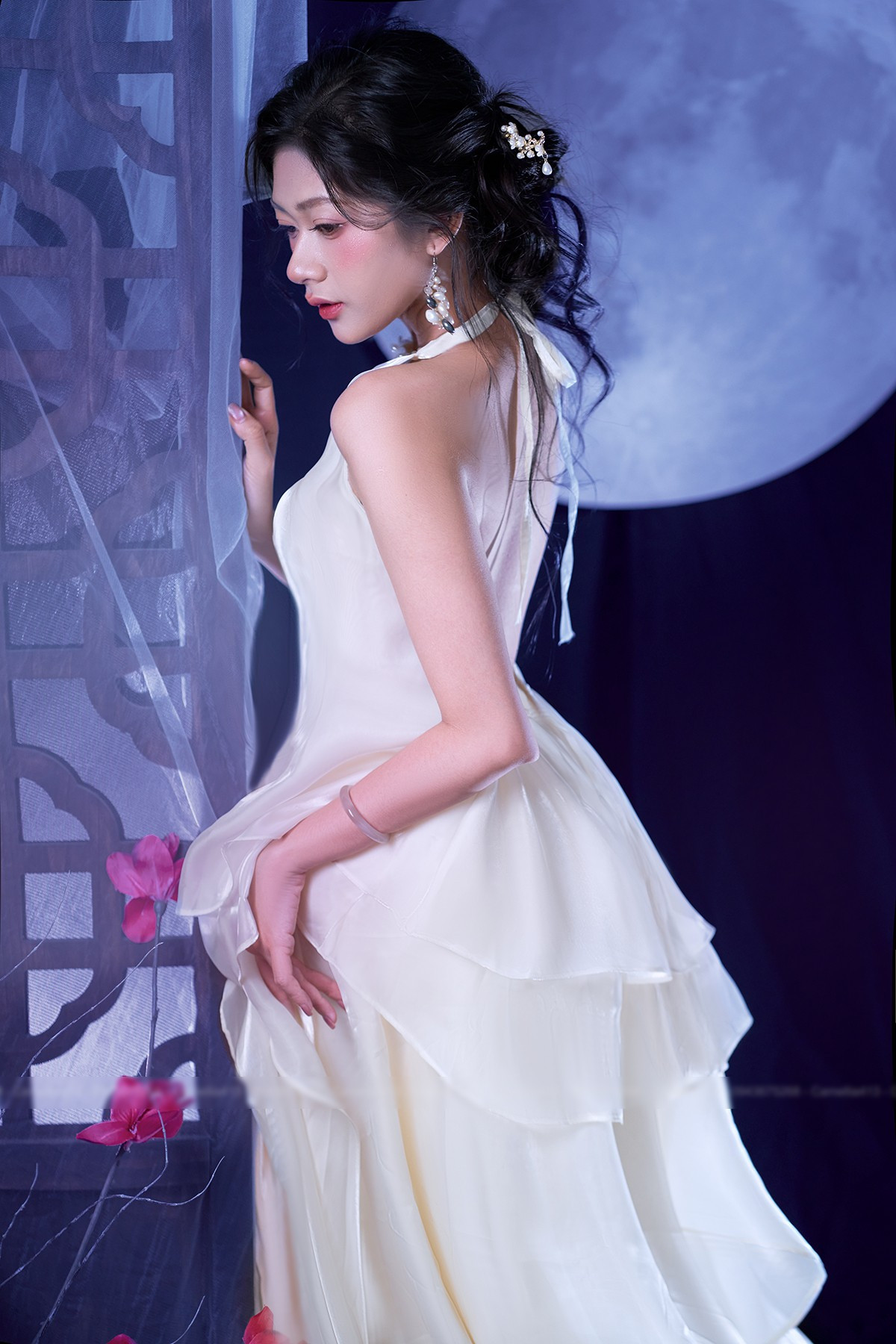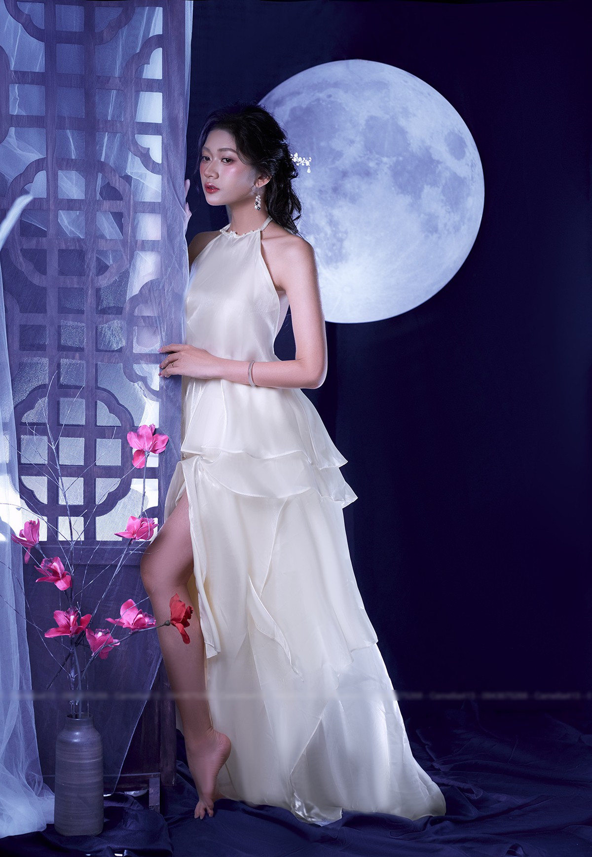 Bộ ảnh của Kim Ngân được lấy cảm hứng từ hình ảnh chị Hằng Nga và vầng trăng tròn, tái hiện nét đẹp cổ điển và ý nghĩa đoàn viên của ngày lễ truyền thống này.