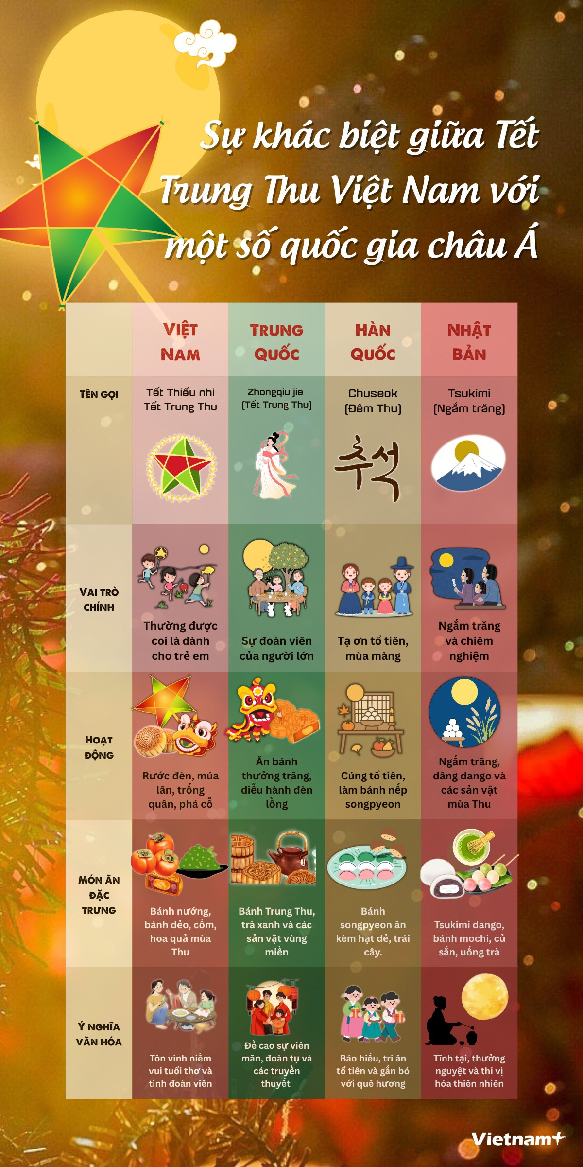 Ngày Tết Trung Thu của Việt Nam cũng mang nhiều nét tương đồng khác biệt so với các quốc gia châu Á khác. Tại Việt Nam, Trung Thu không chỉ là dịp để trẻ nhỏ vui chơi, phá cỗ, rước đèn, mà còn là một nét đẹp trong giá trị văn hóa truyền thống của dân tộc, được gìn giữ và trao truyền qua nhiều thế hệ.