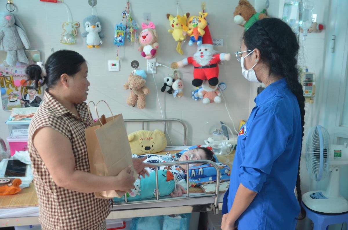 Các em học sinh trao những món quà đến tận tay gia đình và các bệnh nhi đang điều trị nội trú tại Bệnh viện Phụ sản - Nhi Đà Nẵng