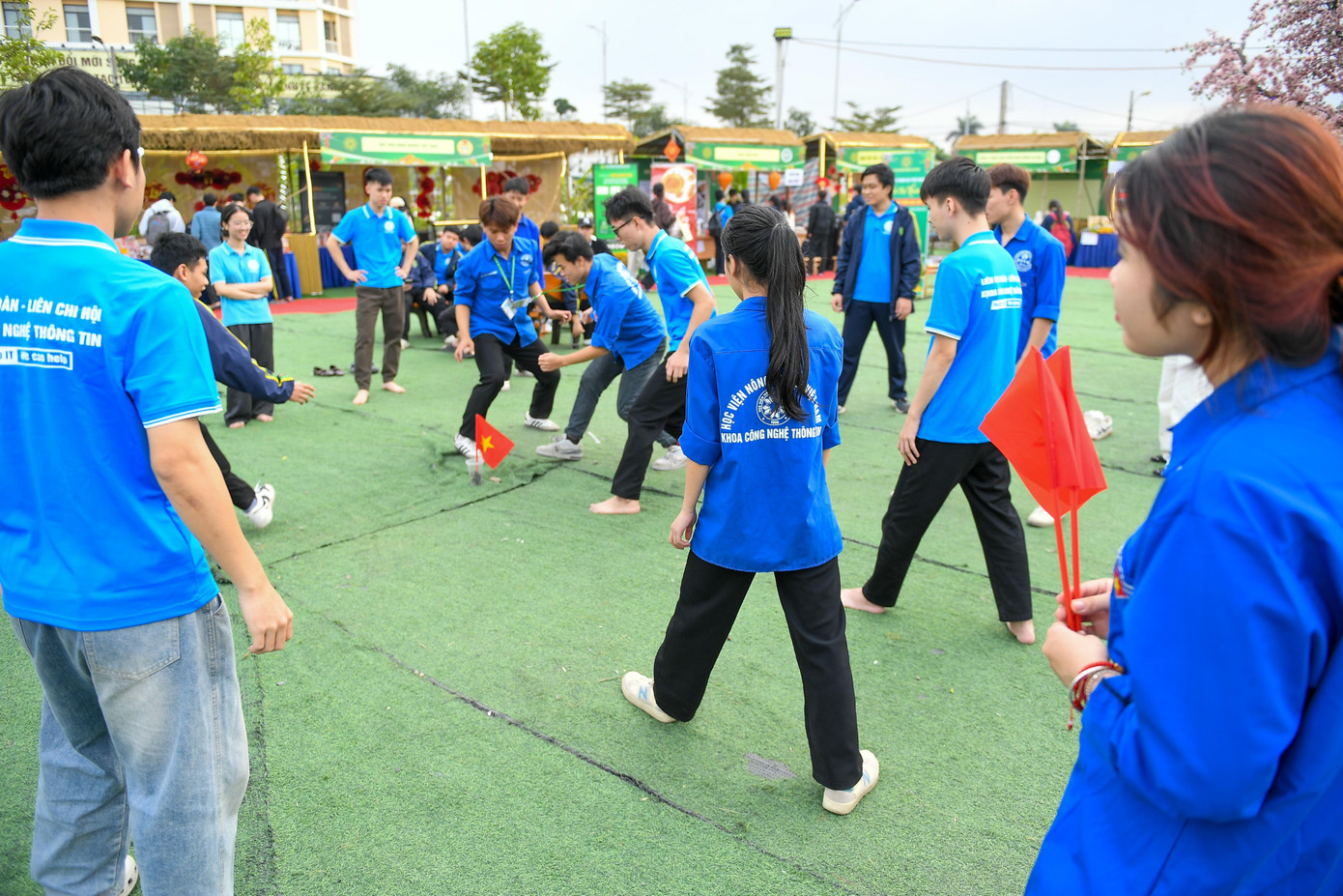 Không khí Tết càng thêm rộn ràng với các trò chơi dân gian như kéo co, nhảy bao bố, bịt mắt bắt dê, ô ăn quan… Những tiếng cười, tiếng cổ vũ vang lên liên tục, tạo nên sự gắn kết tự nhiên giữa sinh viên các khoa, các khóa, giúp các bạn tạm gác lại áp lực học tập trong những ngày cuối năm.