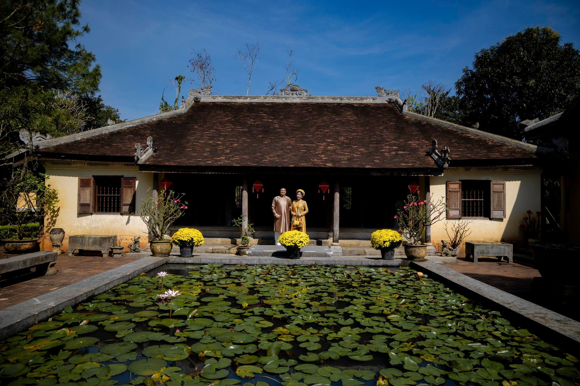 Hồ nước trước nhà như để gia chủ và khách trút bỏ phiền muộn, bụi đường bên ngoài trước khi bước vào nhà. Ảnh: Nhật Bình