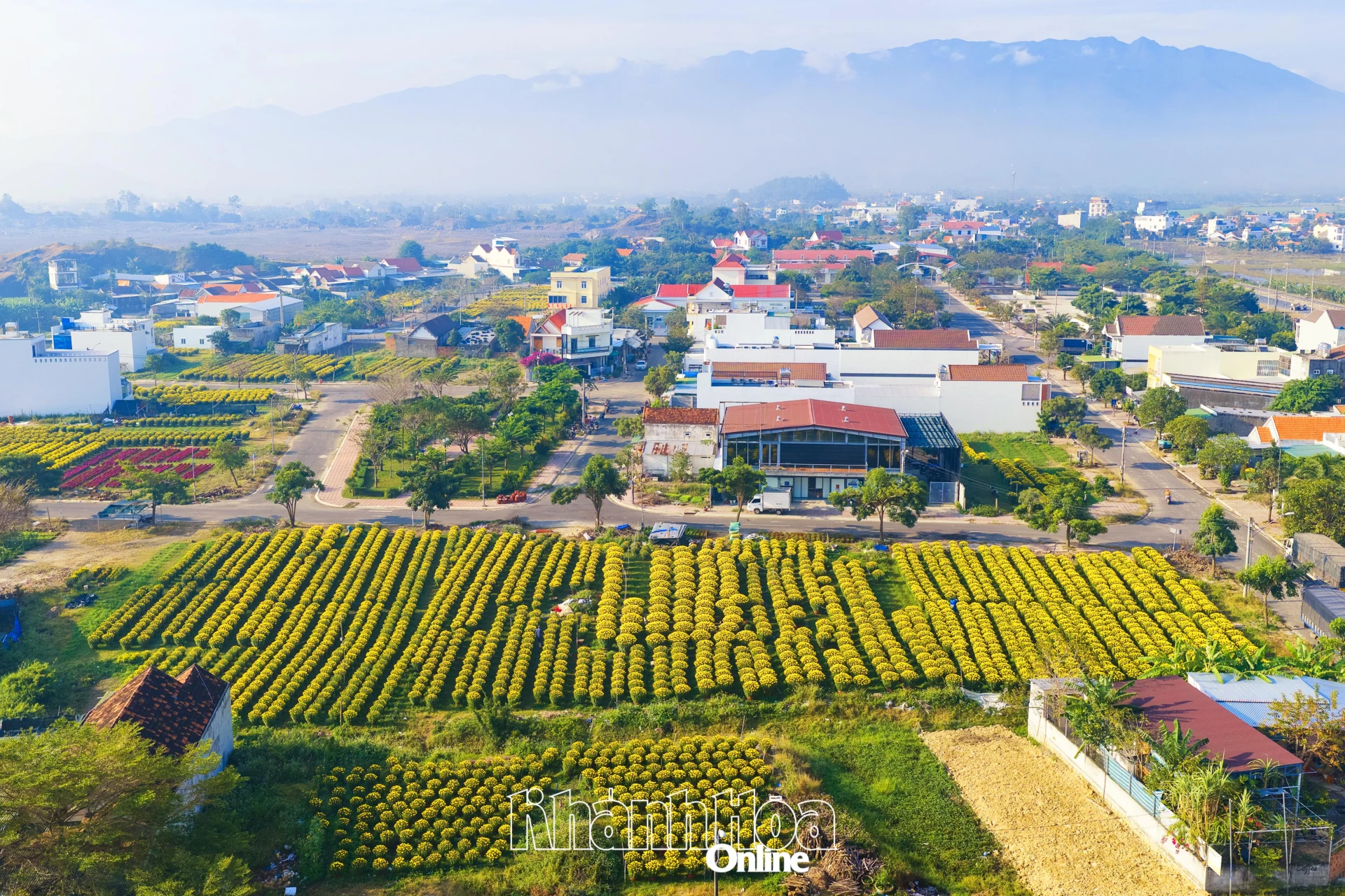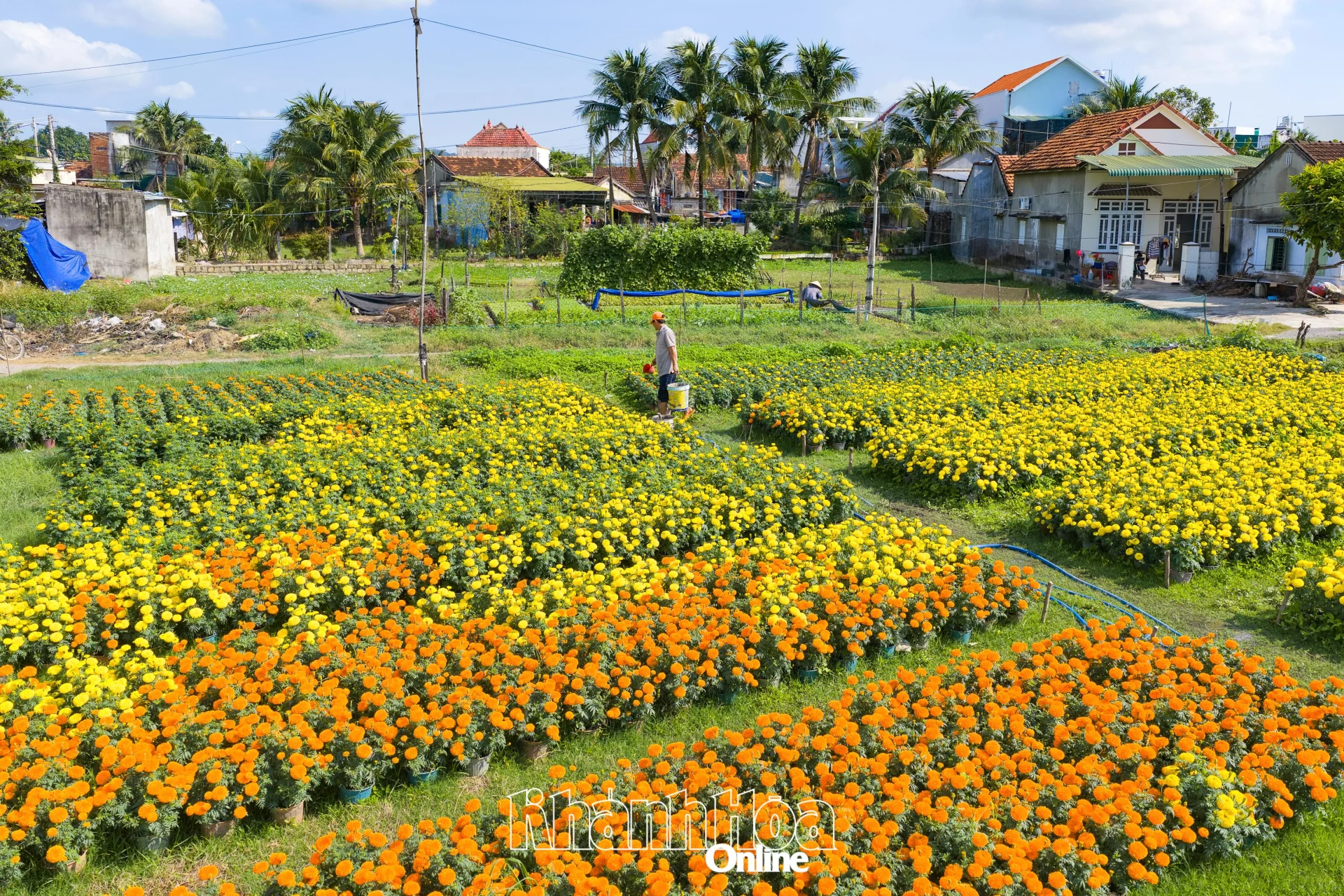Những luống cúc vạn thọ nở bông to, tròn đầy.