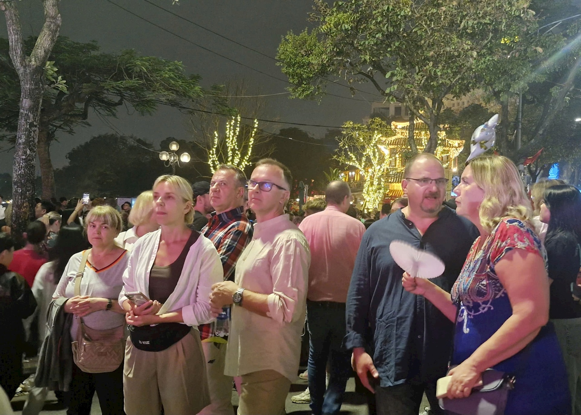 Ông Krzysztof và bà Joanna (Ba Lan) cùng nhiều du khách quốc tế đón Giao thừa với người dân Hà Nội tại Hồ Gươm.