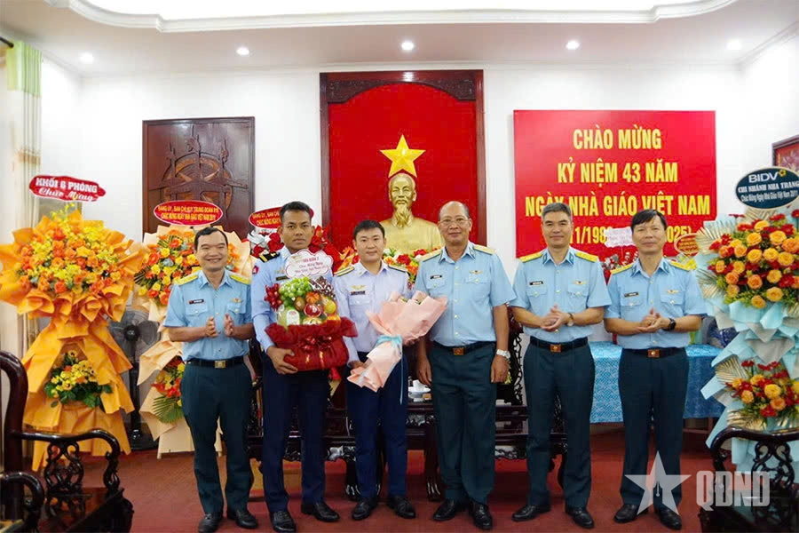 Học viên quốc tế tặng hoa, tri ân Thiếu tướng Ngô Vĩnh Phúc, Hiệu trưởng Trường Sĩ quan Không quân (thứ ba, từ phải sang) và Ban giám hiệu, nhân Ngày Nhà giáo Việt Nam, năm 2025.