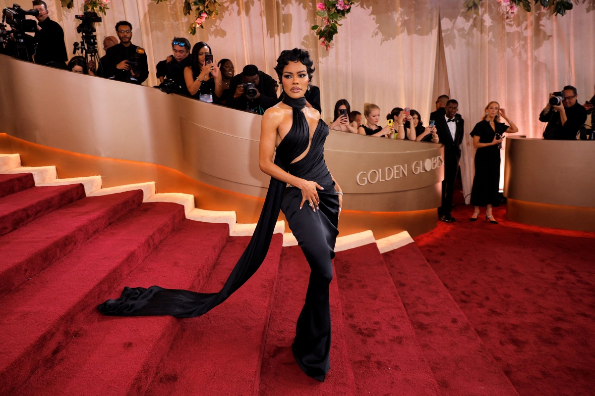 Khoảnh khắc Teyana Taylor xuất hiện cuốn hút trên thảm đỏ Quả Cầu Vàng 2026, đánh dấu cột mốc đáng nhớ trong sự nghiệp điện ảnh.(Ảnh: Reuters)
