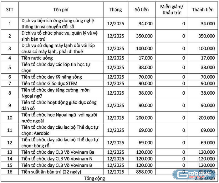 Theo bảng kê này, trong tháng 12/2025, phụ huynh cần đóng số tiền tổng cộng là 2.383.000 đồng, bao gồm 16 mục tiền. Ngoài một số khoản tiền thông thường cần phải đóng như tiền suất ăn bán trú, tiền thuê máy lạnh, tiền ứng dụng công nghệ thông tin, tiền thuê máy lạnh…nhà trường còn thực hiện việc thu các khoản tiền nằm trong chương trình liên kết với đối tác như: Tiền tổ chức Giáo dục STEM (90.000 đồng/học sinh), Tiền tổ chức dạy Kỹ năng sống (70.000 đồng/học sinh), Tiền tổ chức hoạt động Giáo dục công dân số (90.000 đồng/học sinh), Tiền tổ chức học ngoại ngữ với người nước ngoài (200.000 đồng/học sinh).