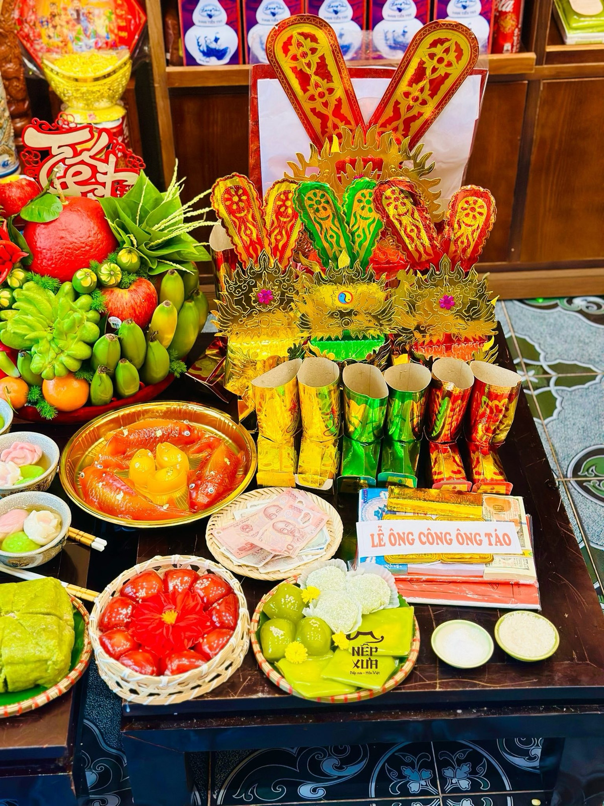 Nhiều món ăn đẹp mắt được tạo hình cá chép trên mâm cúng ông Công ông Táo. (Ảnh: Nếp xưa)