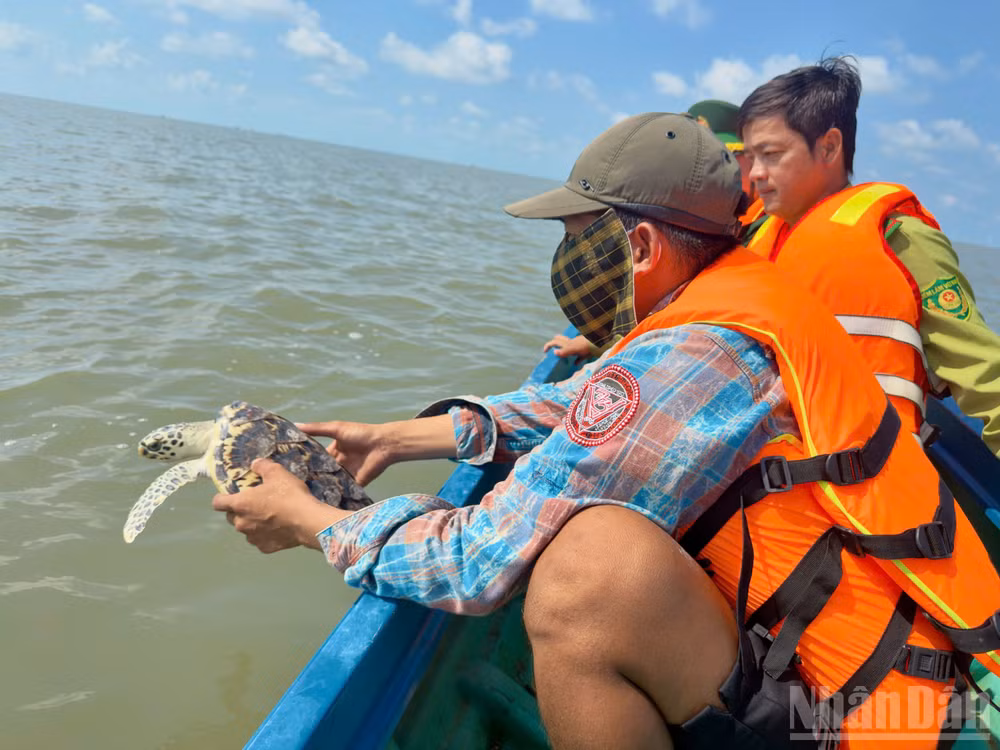 Trước đó vào sáng 18/4, Đồn Biên phòng Tam Giang Tây phối hợp Hạt Kiểm lâm Ngọc Hiển và ngư dân địa phương tiến hành thả một cá thể đồi mồi và một cá thể vích (tên địa phương gọi là rùa biển) trở lại biển sau khi được người dân phát hiện, cứu hộ an toàn.