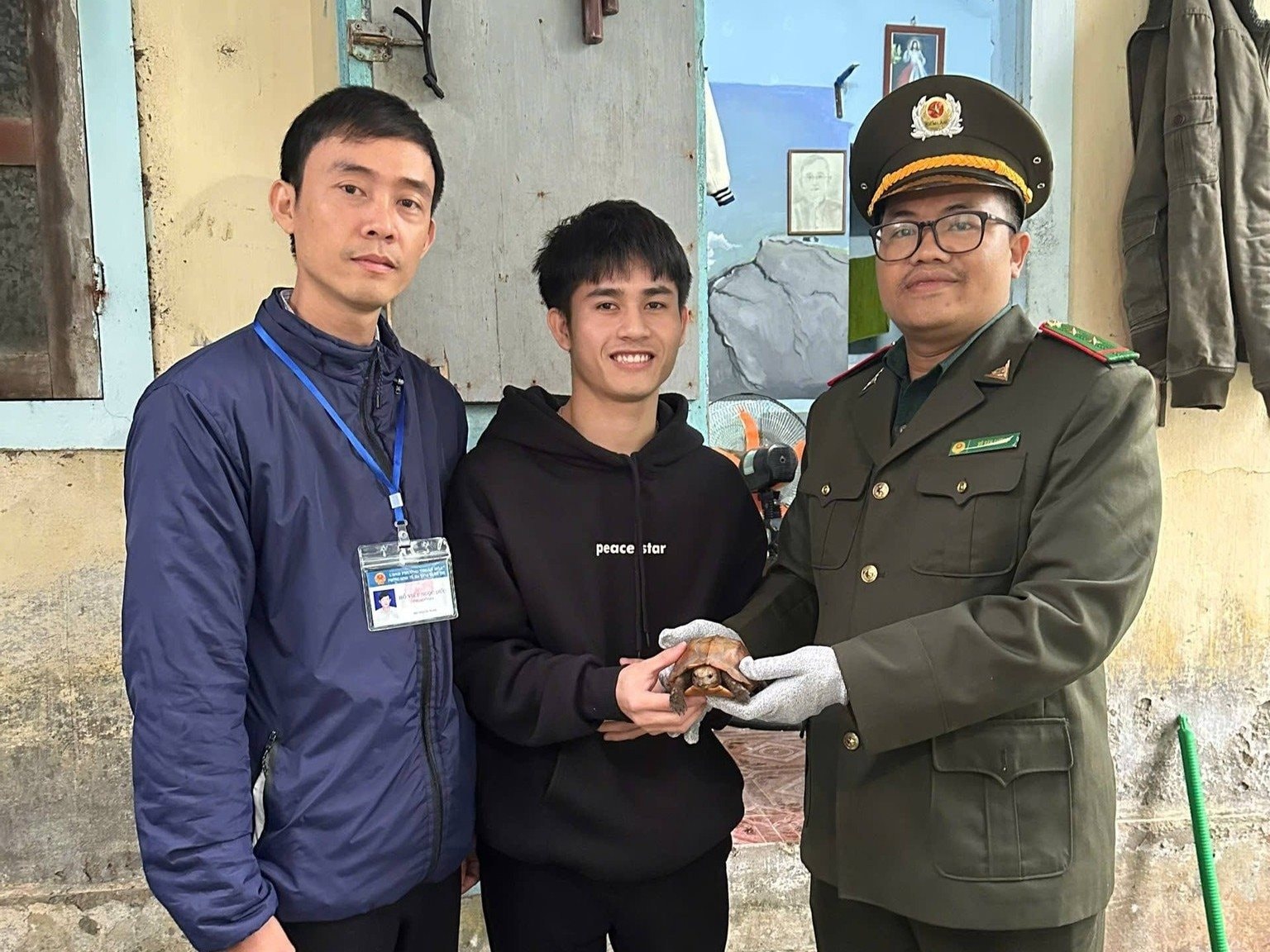 Trước đó, cá thể rùa này do anh Hoàng Minh Hưng, sinh viên Trường Đại học Khoa học - Đại học Huế, hiện tạm trú trên địa bàn phường Thuận Hóa, TP. Huế phát hiện bò vào phòng trọ.