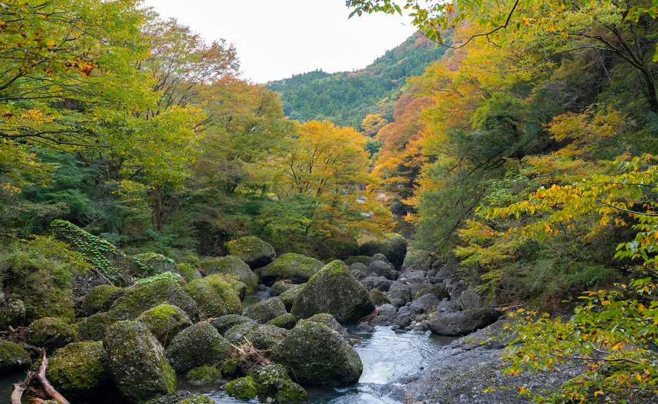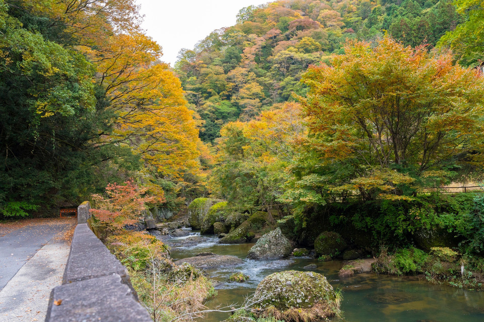 Khung cảnh thiên nhiên dưới chân thác Fukuroda vào mùa Thu. (Ảnh: Xuân Giao/TTXVN)