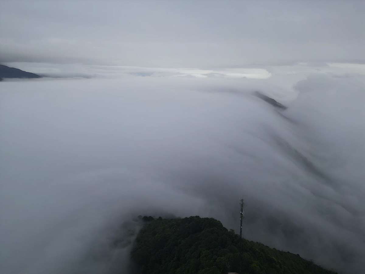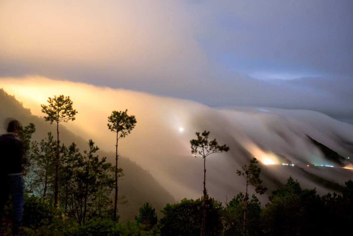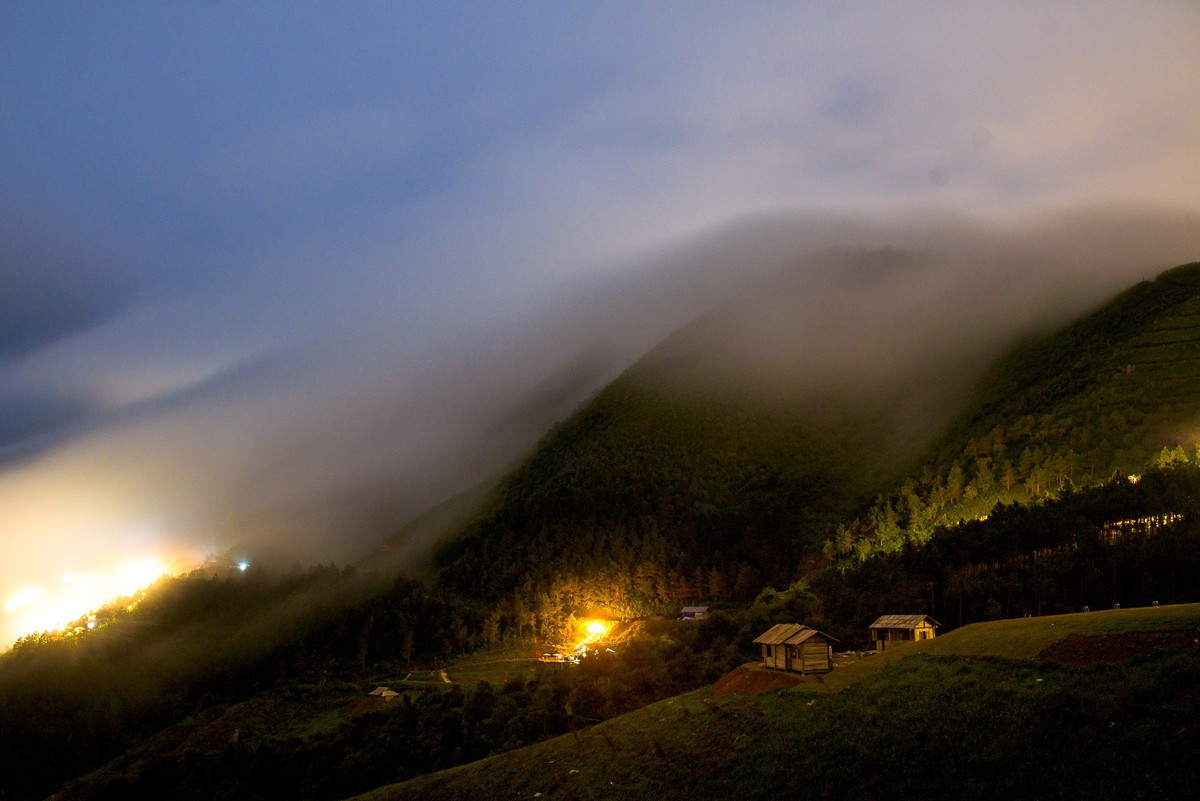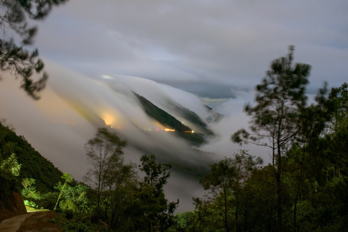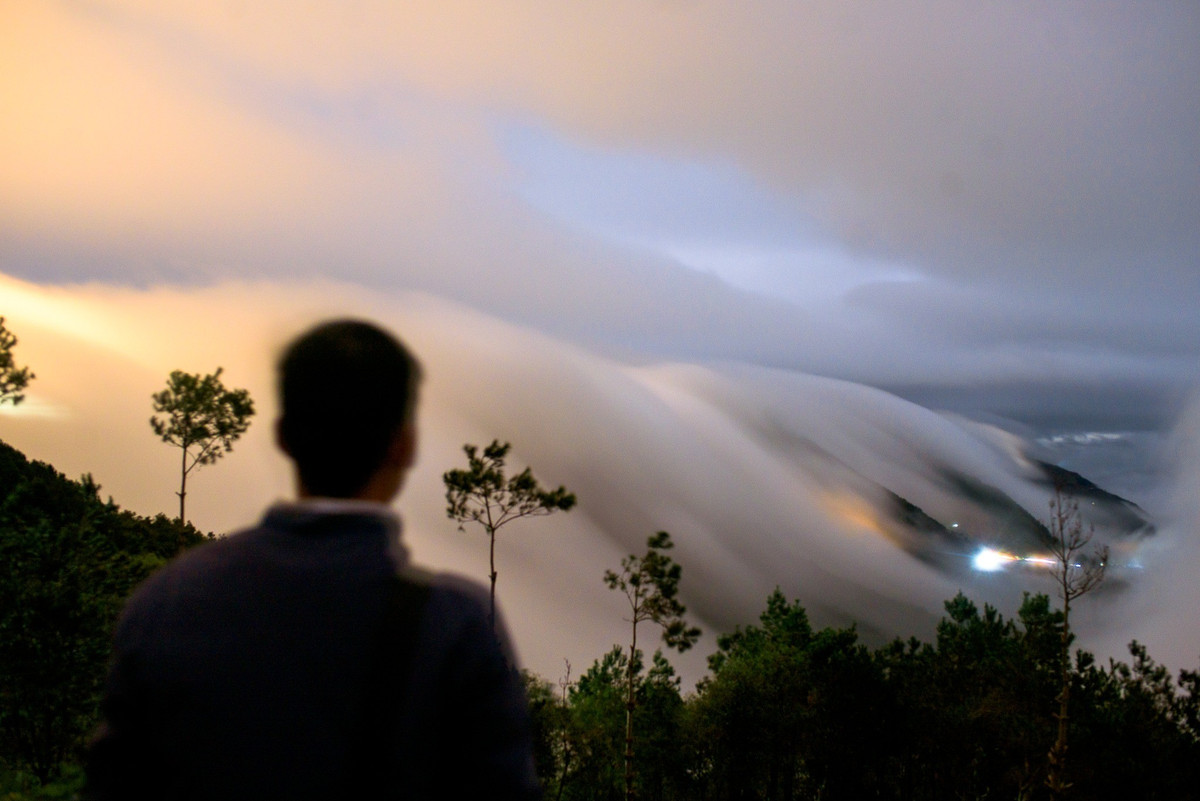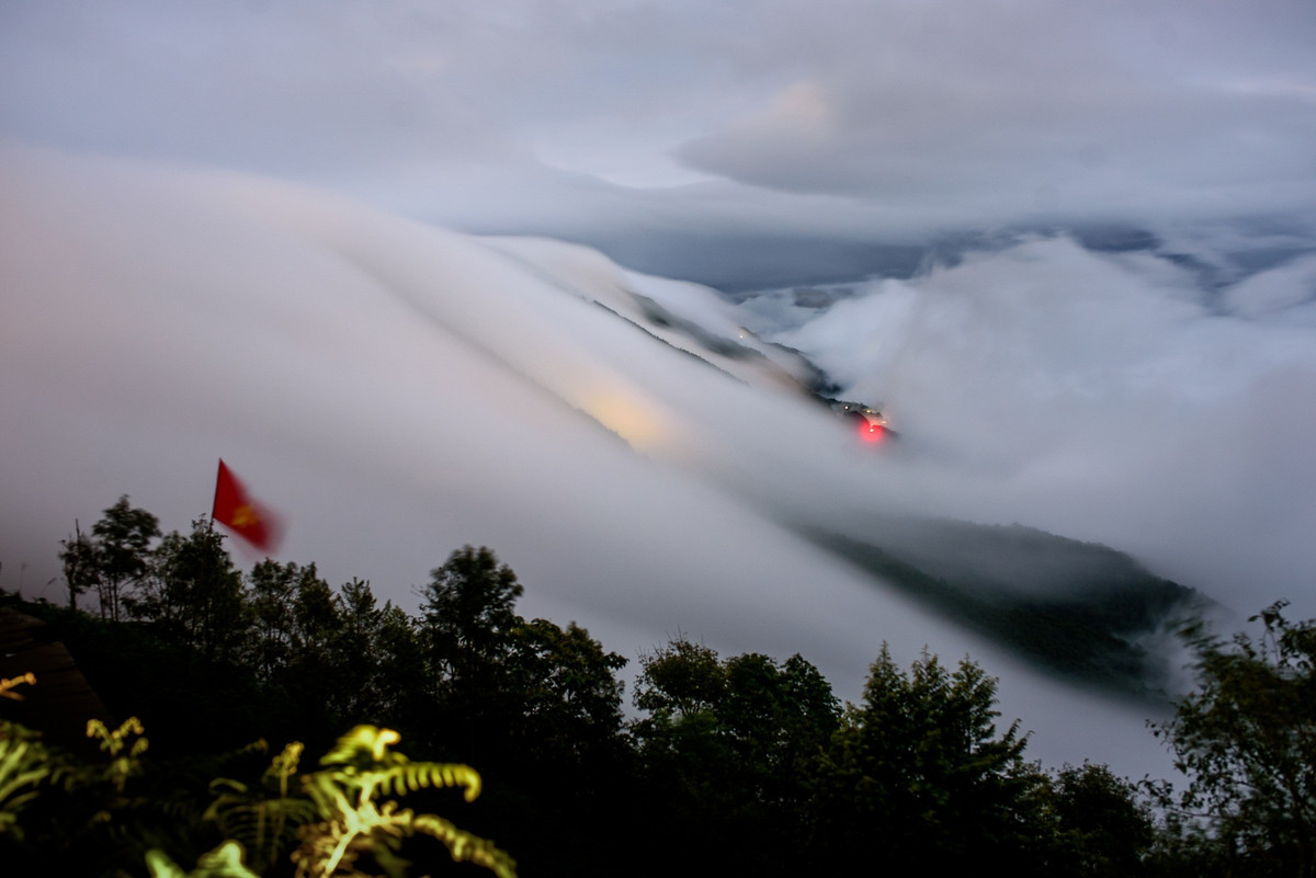 Được biết hiện tượng thác mây chỉ xuất hiện khi chênh lệch nhiệt độ giữa đỉnh và thung lũng đủ lớn. Khi đêm xuống, hơi nước tích tụ trong thung lũng; đến lúc mặt trời ló rạng, mây bắt đầu dồn lên, tạo thành dòng chảy trắng mềm mại như dải lụa. Ảnh Anh Sói