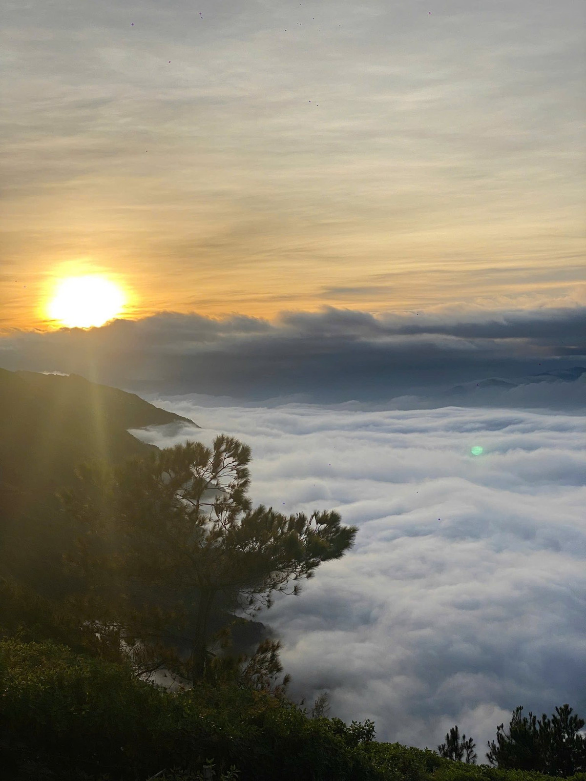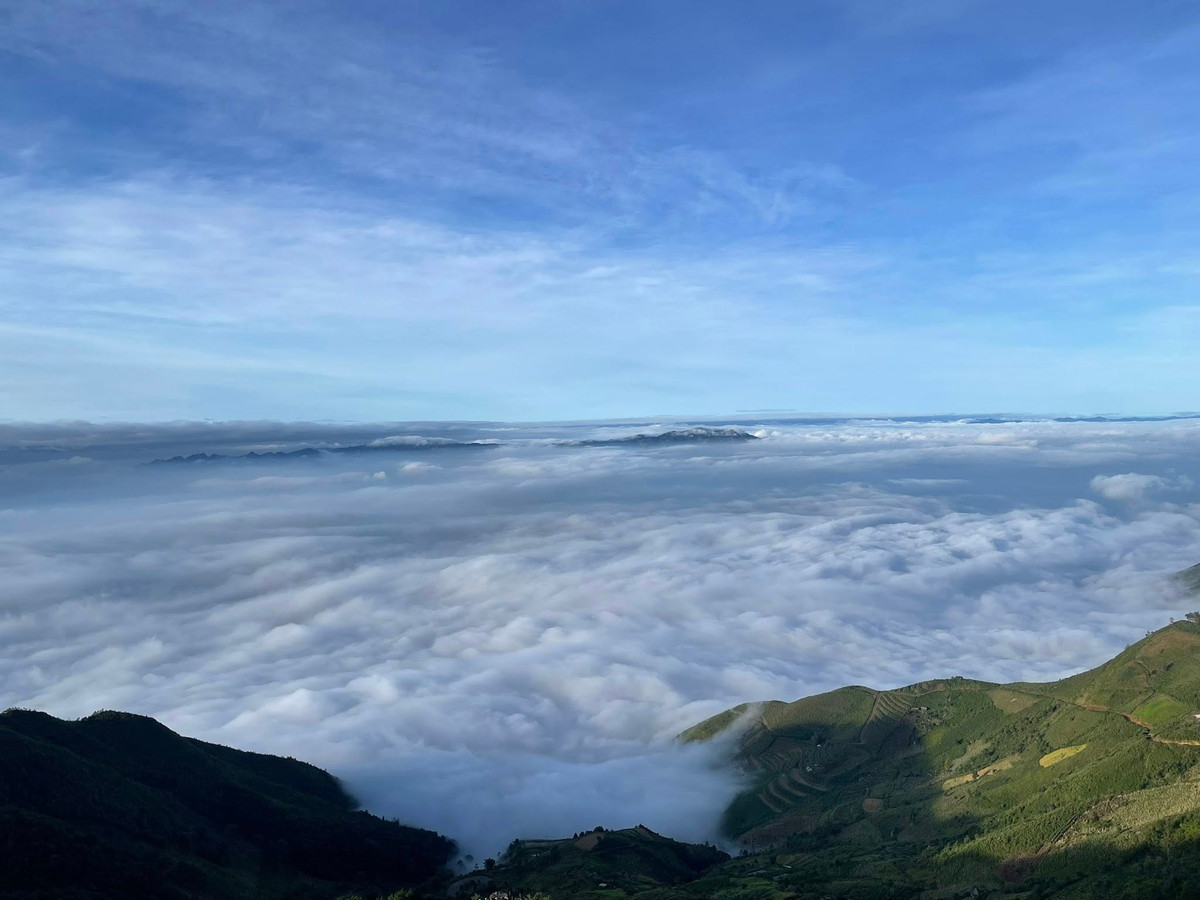 Từ sáng sớm, những khối mây dày đặc dâng lên từ thung lũng, cuộn tràn qua sườn núi, tạo nên hiện tượng thác mây kỳ ảo. Cảnh tượng này được ví như “biển trời lững lờ trôi”, khiến bất kỳ ai từng một lần chứng kiến cũng khó quên. Ảnh Anh Sói
