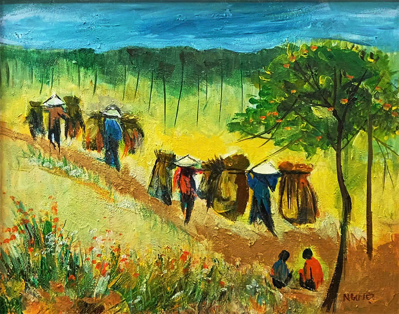 Bức tranh Mùa gặt của nữ họa sĩ Minh Nguyệt, lớp Âm thanh hội họa dành cho người khuyết tật. Ảnh: T.T.B