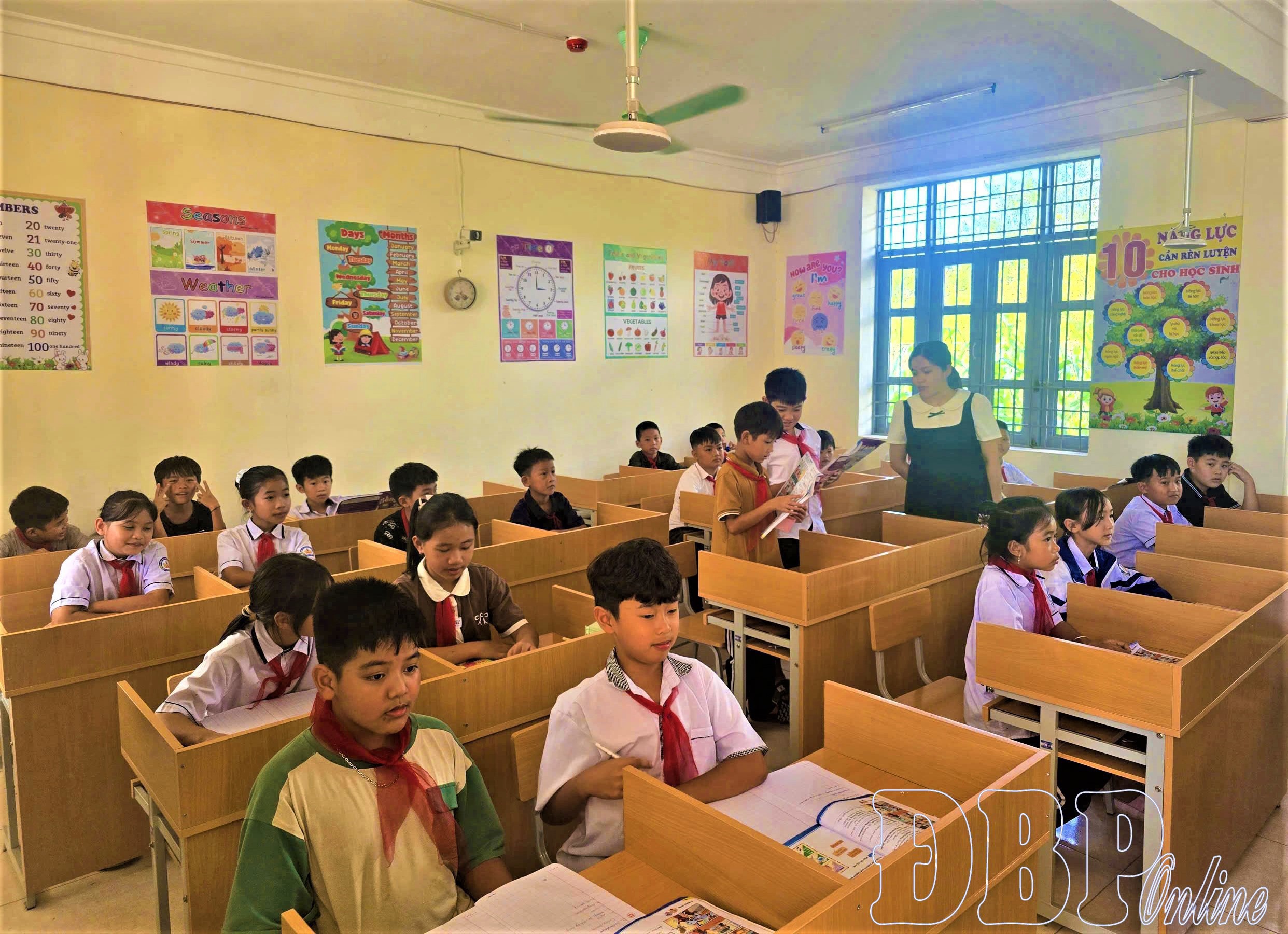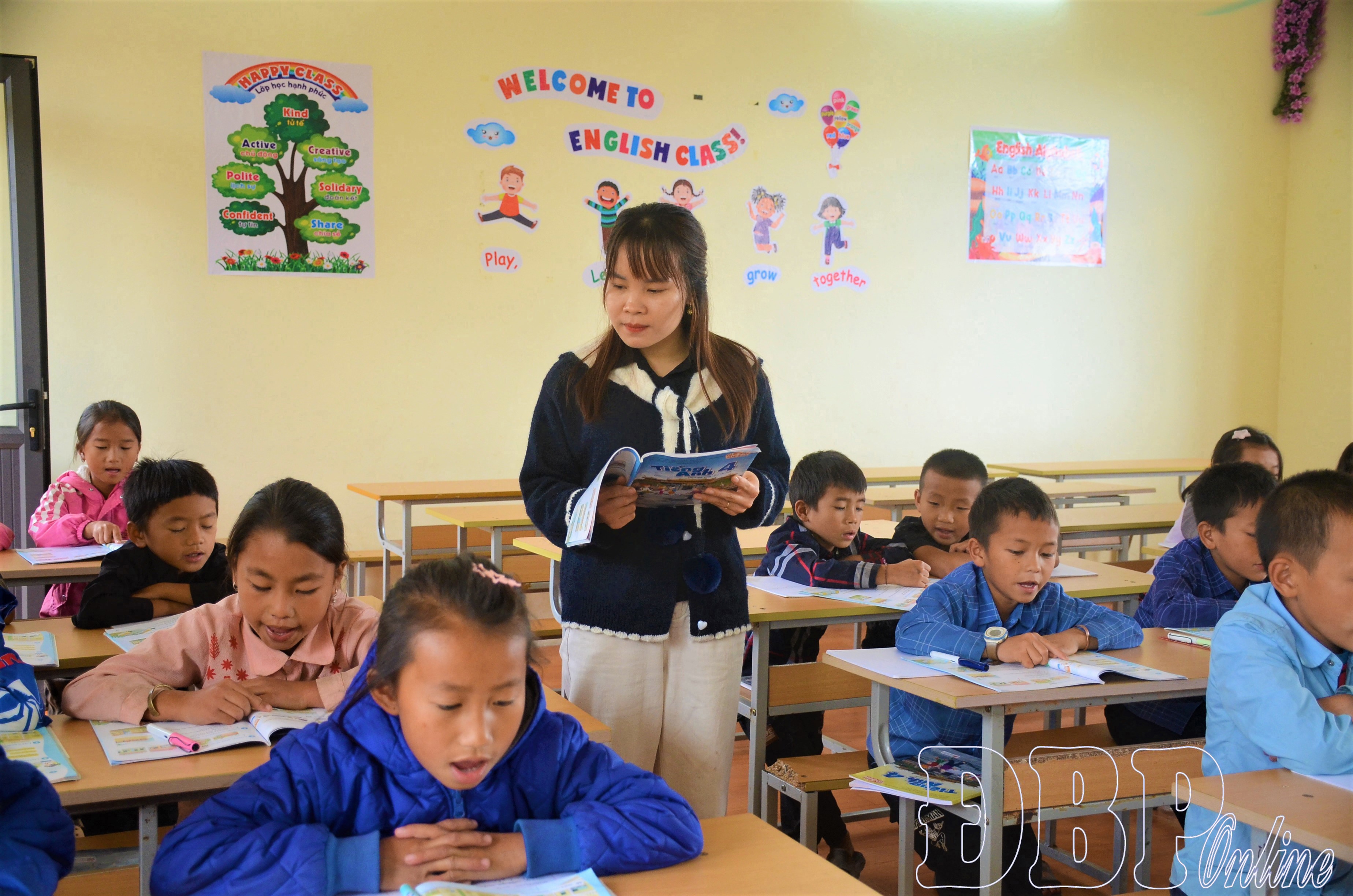 Việc 100% cơ sở giáo dục dạy môn Tiếng Anh bắt buộc từ lớp 1 là một chủ trương mang tầm nhìn dài hạn, tạo ra một thế hệ công dân toàn cầu. Trong ảnh: Giờ hoc Tiếng Anh tại Trường Tiểu học và THCS Nà Sáy.