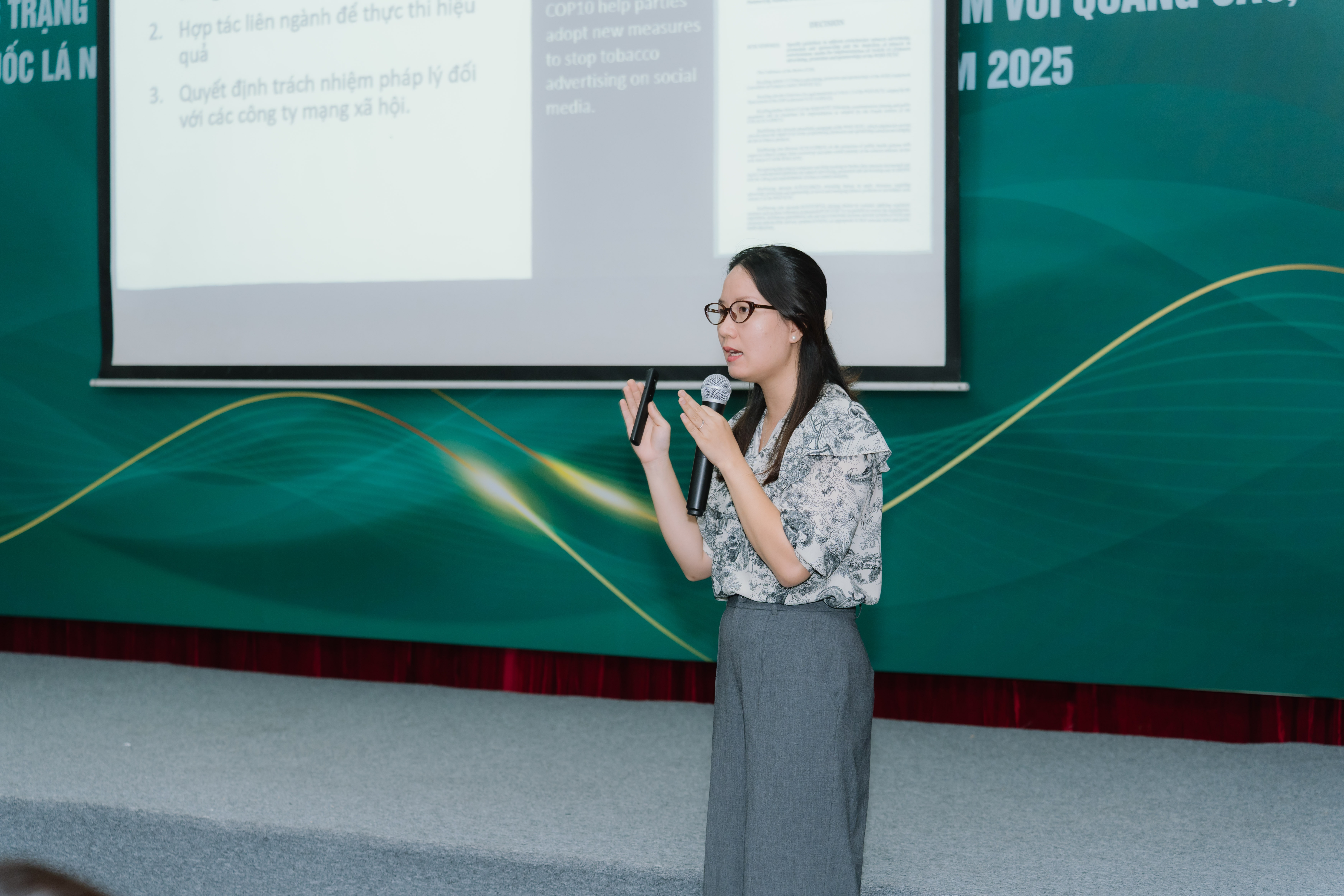 Đại diện tại của Tổ chức Campaign for Tobacco Free Kids, ThS. Bùi Thị Thu Giang, Quản lý chương trình, chia sẻ bằng chứng từ nghiên cứu quốc tế cho thấy các tập đoàn thuốc lá lớn nhất thế giới đang sử dụng Facebook, Instagram, X và TikTok để quảng bá sản phẩm thuốc lá mới.