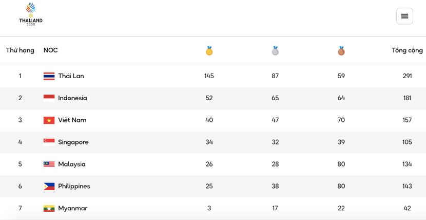 Sau 6 ngày thi chính thức, đoàn Việt Nam có tổng cộng 40 huy chương vàng, tạm xếp hạng ba trên bảng tổng sắp. Trong 5 ngày thi còn lại, từ 16 đến 20-12, các vận động viên sẽ nỗ lực tối đa để giúp đoàn hoàn thành chỉ tiêu giành từ 90 đến 110 huy chương vàng, xếp tốp đầu chung cuộc.