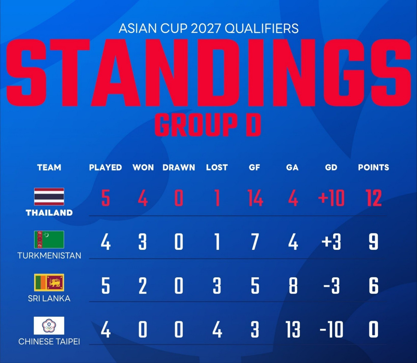 Tại bảng D thuộc vòng loại ba Asian Cup 2027, Thái Lan vươn lên dẫn đầu với 12 điểm, nhiều hơn Turkmenistan 3 điểm nhưng đối thủ còn một trận chưa đấu. Ngay sau trận Thái Lan thắng Sri Lanka, Turkmenistan chạm trán Đài Bắc Trung Hoa và nhiều khả năng cách biệt điểm số của "Voi chiến" sẽ bị cân bằng.