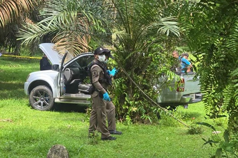 Cảnh sát Thái Lan đã tìm thấy một chiếc xe bán tải được sử dụng trong vụ cướp vàng bị bỏ lại tại một đồn điền ở quận Waeng, tỉnh Narathiwat, hôm 6/10/2025. Ảnh: Bangkok Post