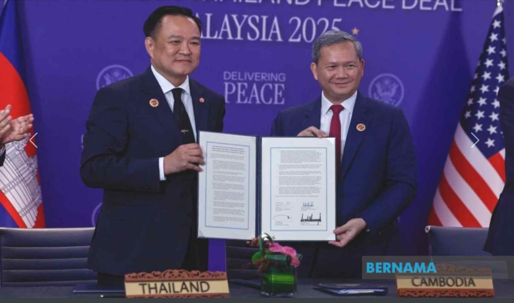 Thủ tướng Thái Lan và Thủ tướng Campuchia ký tuyên bố chung về thỏa thuận hòa bình. Ảnh: BERNAMA