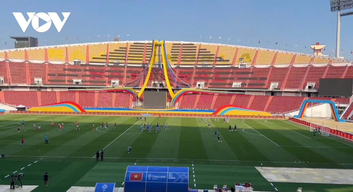 Sân vận động Rajamangala (Bangkok) nơi diễn ra trận bóng giữa U22 Việt Nam gặp U22 Lào trong khuôn khổ bảng B, môn bóng đá nam SEA Games 33, hôm 3/12/2025. (Ảnh: Ngọc Diệp).