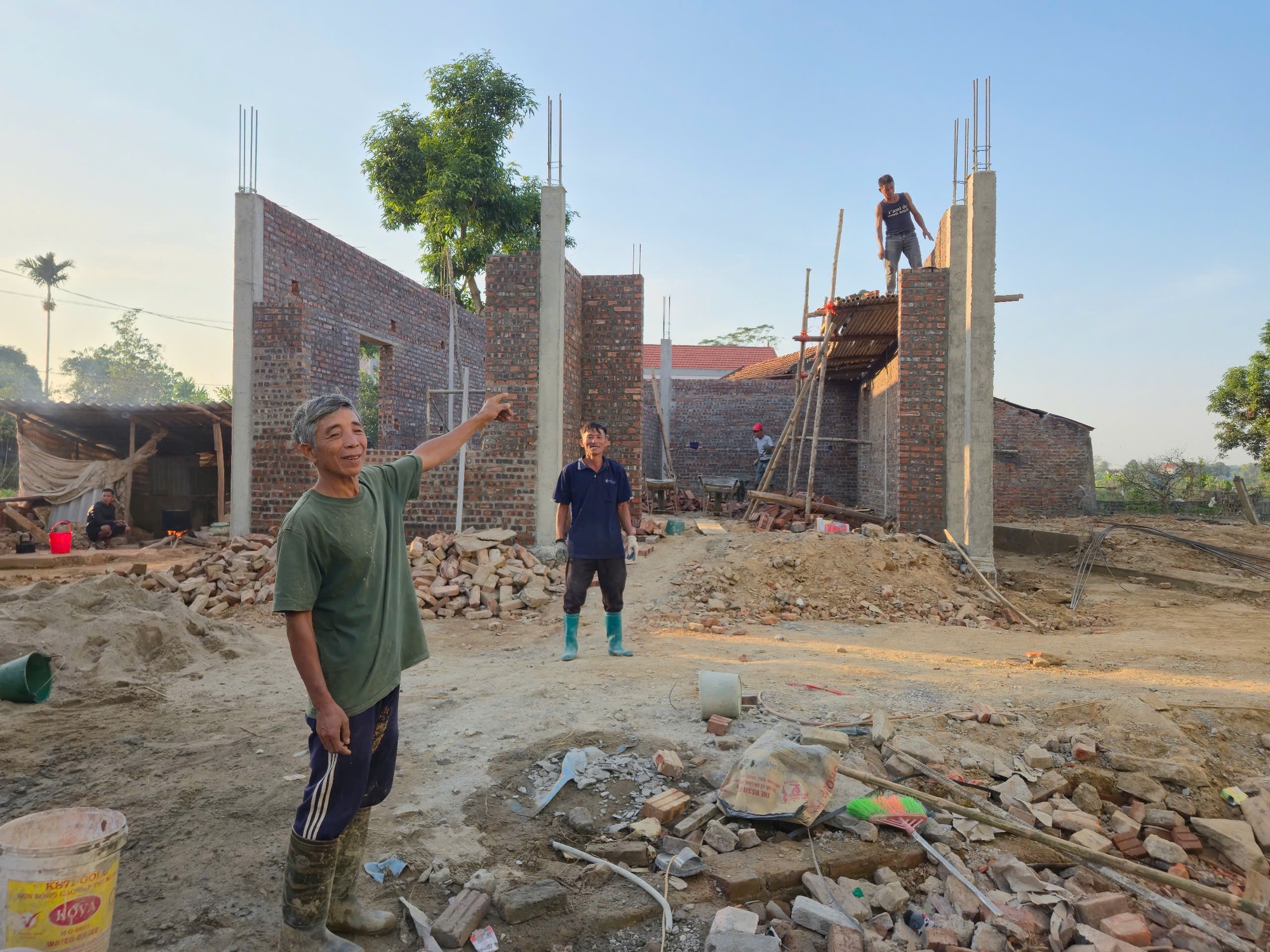 Ông Dương Văn Tịnh, xóm Đồng Áng, xã Phú Bình vui mừng chia sẻ với phóng viên về ngôi nhà mới đang xây dựng sau lũ.