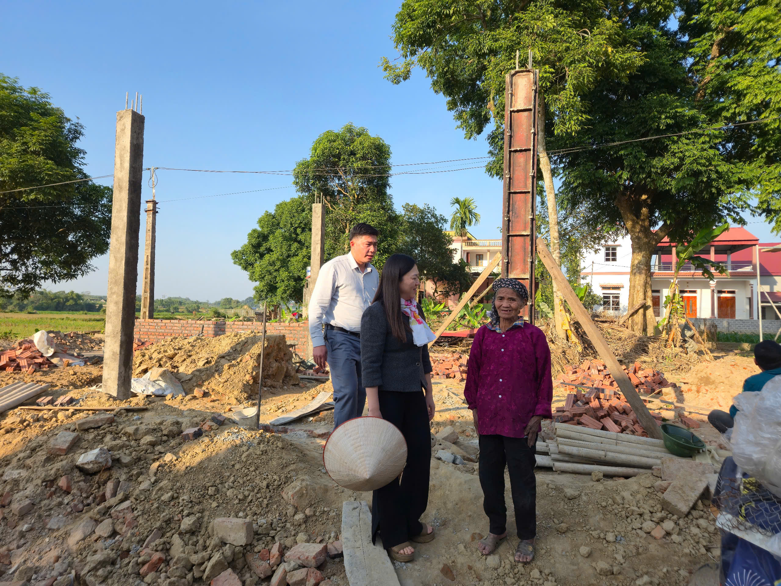 Lãnh đạo xã Phú Bình thăm hỏi, kiểm tra tiến độ xây nhà cho gia đình bà Dương Thị Bộ.