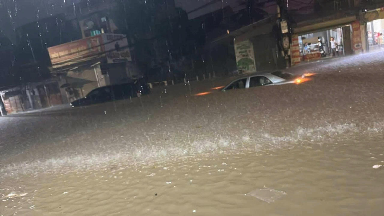 Mưa lớn từ tối 6/10 đến sáng 7/10 khiến nhiều tuyến phố bị ngập, ô tô chìm nghỉm trong nước. Ảnh: Bạn đọc cung cấp.