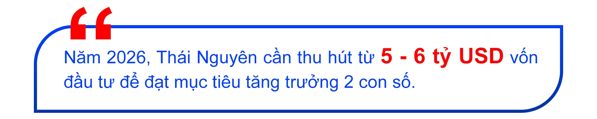 Áp lực tăng trưởng hai con số trong năm 2026 không cho phép Thái Nguyên đi chậm. Theo tính toán của các cơ quan chuyên môn, để đạt mục tiêu này, Thái Nguyên cần thu hút từ 5 - 6 tỷ USD vốn đầu tư công nghiệp, một con số đầy tham vọng trong bối cảnh cạnh tranh ngày càng gay gắt giữa các địa phương.