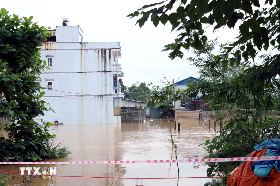 Khu dân cư phía trong đê bối bị ngập hoàn toàn. (Ảnh: Trần Trang/TTXVN)