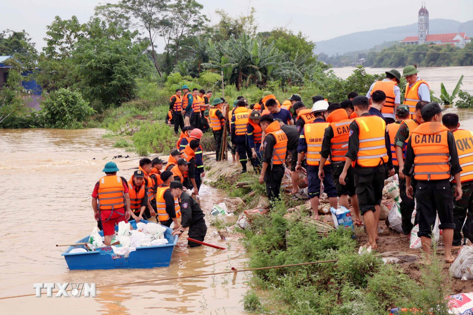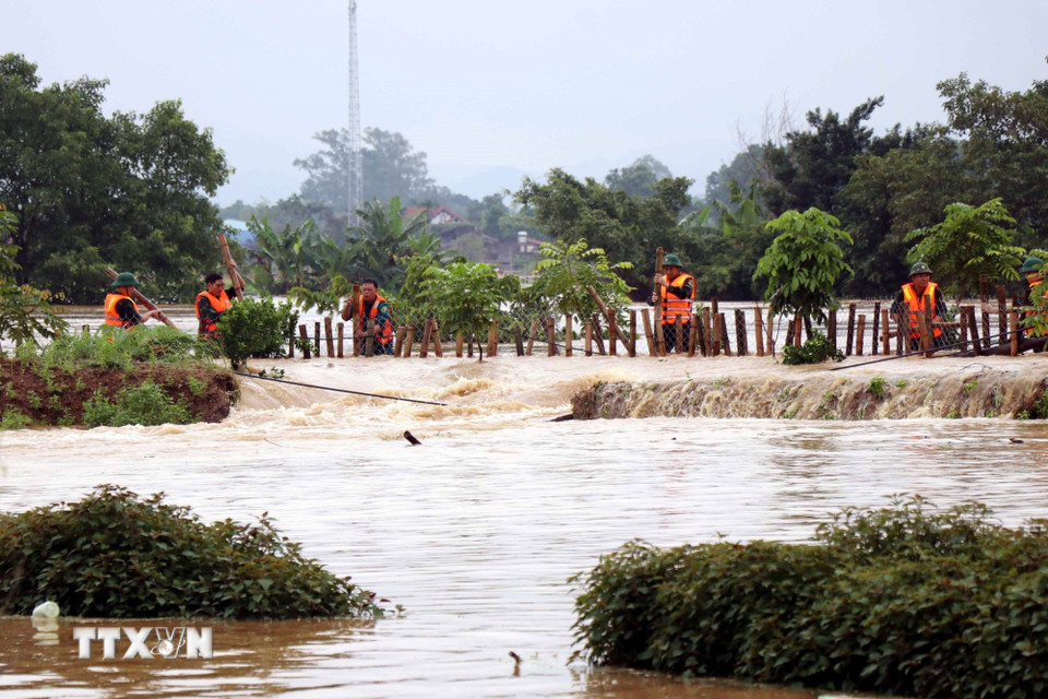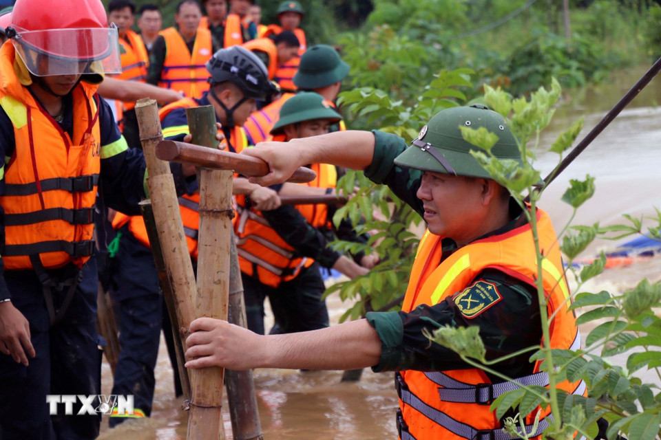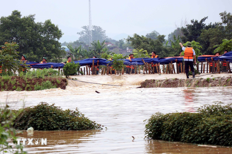 Lực lượng Quân đội và Công an được huy động khắc phục vỡ đê bối sông Cầu. (Ảnh: Trần Trang/TTXVN)