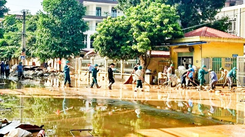 Dân quân vệ sinh môi trường đô thị trung tâm tỉnh Thái Nguyên sau lũ.