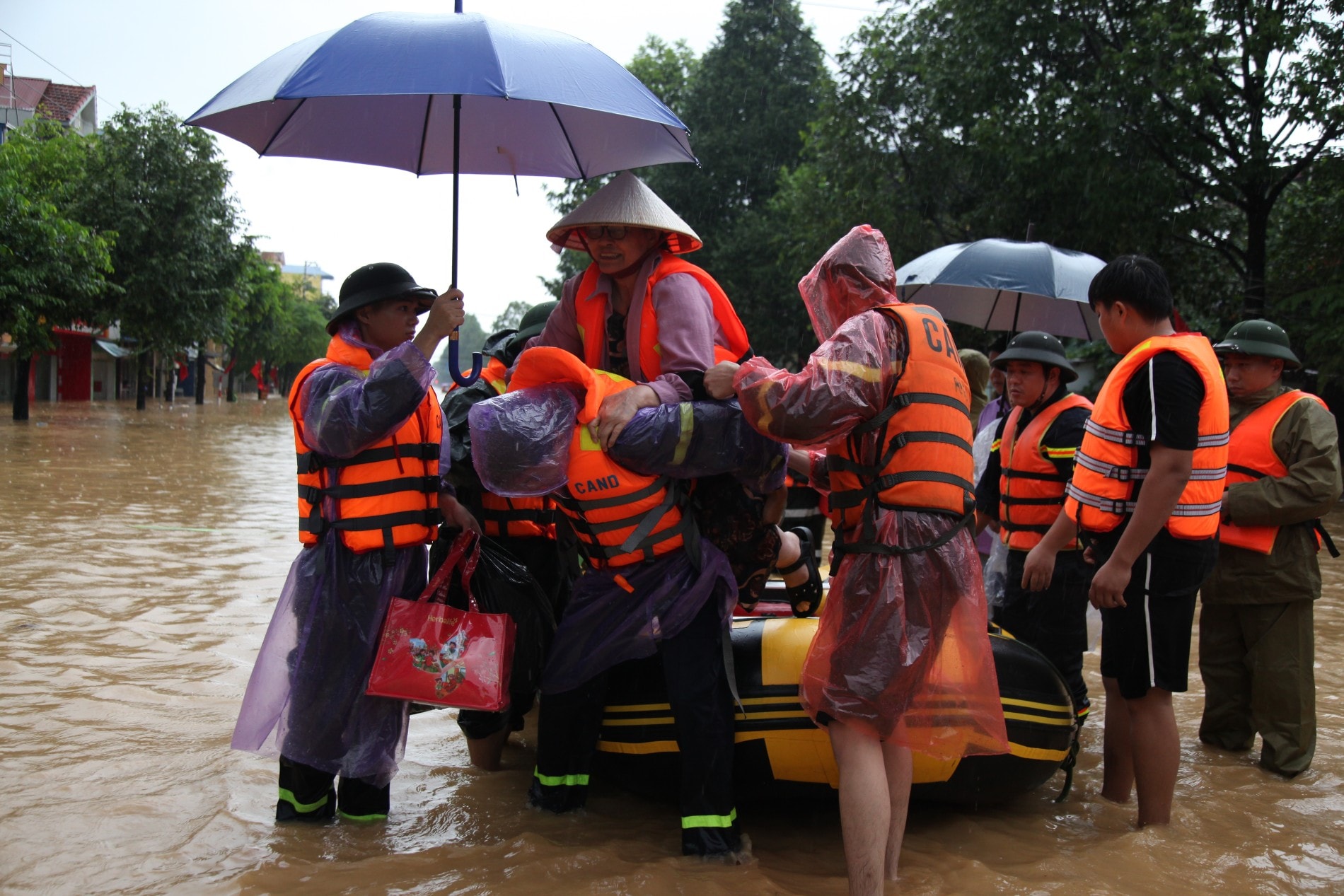 Lực lượng Công an hỗ trợ di chuyển người dân ra khỏi khu vực ngập lụt tại khu vực cầu Mỏ Bạch, Thái Nguyên