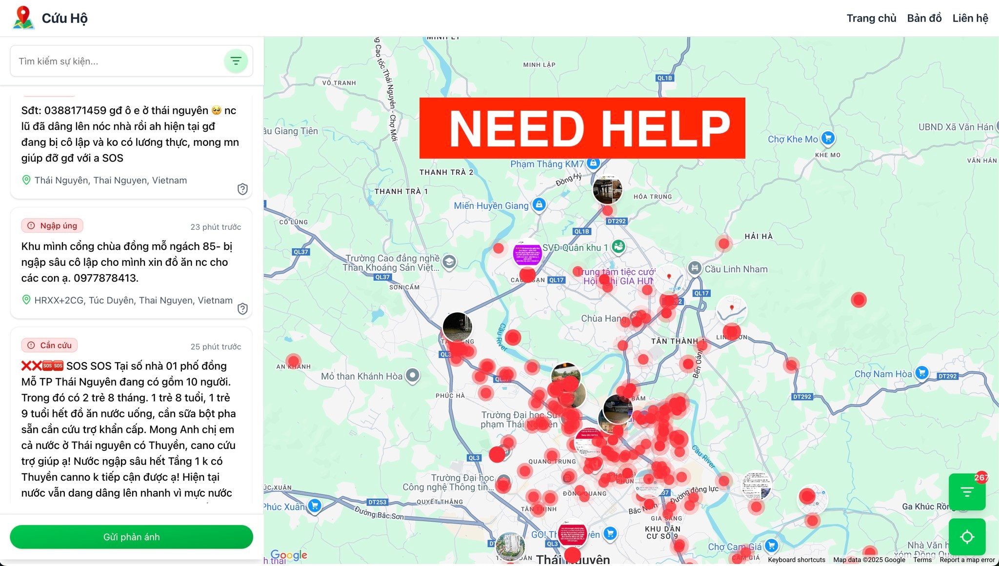 Bản đồ nhiệt hiển thị nhu cầu cứu hộ của người dân tại Thái Nguyên được cập nhật từng giờ, giúp các lực lượng chức năng và đội cứu hộ dễ dàng xác định vùng bị ảnh hưởng lớn và phối hợp ứng cứu hiệu quả hơn. Ảnh: Tất Huân